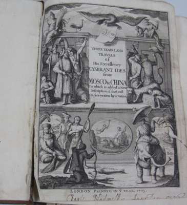 Three years travels from Moscow over-land to China... London: W. Freeman, J. Walthoe, T. Newborough, J. Nicholson and R. Parker, 1706. 4to, engraved title (torn), 25 (of 30) plates, pp.83-84 burned with some loss to text, lacking map, tears to some plates, including one torn into two, some spots and stains, contemporary calf, rubbed, worming to lower joint
