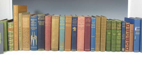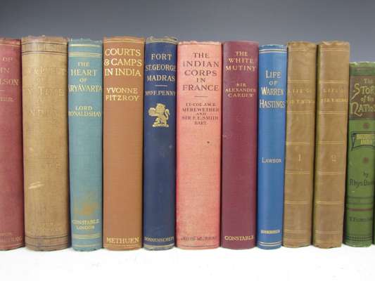 Curry & rice. 1911. 4to, Fifth edition, plates, pictorial cloth, contents largely detached; Macfarlane, C. History of British India. 1886. 8vo, calf gilt; [Madura] Madura. A tourist's guide. Madras, 1913. 8vo, cloth-backed boards; Ronaldshay, Earl of The heart of Aryavarta. 1925. 8vo, cloth; Penny, F.E. Southern India. 1914. 8vo, plates, decorative cloth, slightly rubbed; Temple, Sir R. Men and events of my time in India. 1882. A.L.S. from author tipped in, cloth, spine faded; Fitzroy, Y. Courts and camps in India. 1926. 8vo, cloth soiled; MacMunn, G.F. The armies of India. 1911. 8vo, Bangalore HQ library stamps, cloth soiled; Penny, F. Fort St. George Madras. 1900. 8vo, cloth; Menpes, M. The people of India. 1910. 4to, mounted plates, cloth soiled; and 16 others on India; sold not subject to return (26)