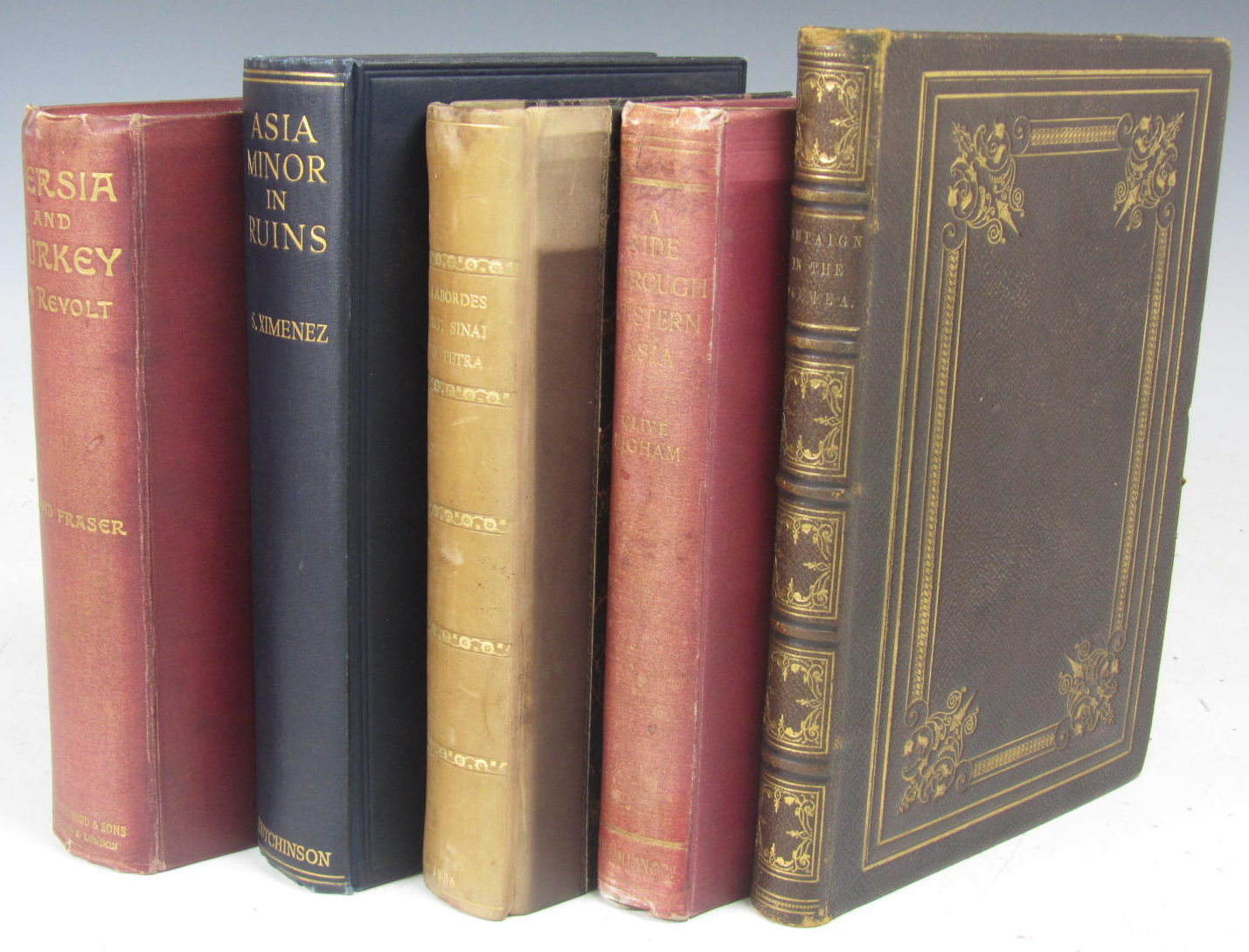 Journey through Arabia Petraea to Mount Sinai and the excavated city of Petra..., 1836. 8vo, plates, later quarter calf; Bigham, Clive A ride through western Asia, 1897. 8vo, red cloth gilt; Simpson, William The campaign in the Crimea, 1855. 8vo, chromolithographed plates; Ximinez, Saturnino Asia Minor in ruins, [n.d., 1925] 8vo, blue cloth gilt; Fraser, David Persia and Turkey in revolt. Edinburgh: William Blackwood, 1910. 8vo, red original red cloth; sold not subject to return (5)