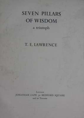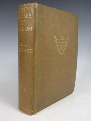 Seven pillars of wisdom. London: J. Cape, 1935. 5th impression, 4to, inscribed on endpaper "To my very dear friend, [Dr. Anthony Roy] Hyett, from A.E. (Jock) Chambers", 48 plates, 4 folding maps, original buckram; with 3pp. annotated typed notes by Jock Chambers (2pp relating to Chambers' naval service in 1914-18 & a naval ballad heard on naval service; 1pp. relating to Seven Pillars and "the last days at Cloud Hill"), 4 photographs (2 of Chambers at Lawrence's funeral service, one annotated on verso identifying Chambers, Eric Kennington and Augustus John), Jock on a bicycle, and Chambers pointing to himself in the photograph of Lawrence's funeral service), 2 reproductions of photographs of Lawrence, photocopy of wrapping paper of parcel posted to A.E. (Jock) Chambers from Bovington Camp, Wareham, Post Office on 13 May 1935, photocopy of brief note initialled TES, and newspaper article from Bournemouth Evening Echo, 10 Sept. 1971 on Lawrence, Jock and the "Dead Woman's Stone"