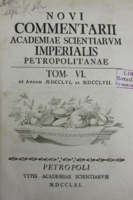 Novi commenatarii Academiae scientiarum imperialis Petropolitanae. St. Petersburgh, 1751-61. Volumes 2-7 only, folding plates, contemporary calf, some dust-soiling and spotting, RCSI library stamps to title pages and a few other leaves, very worn, a few boards detached; sold not subject to return