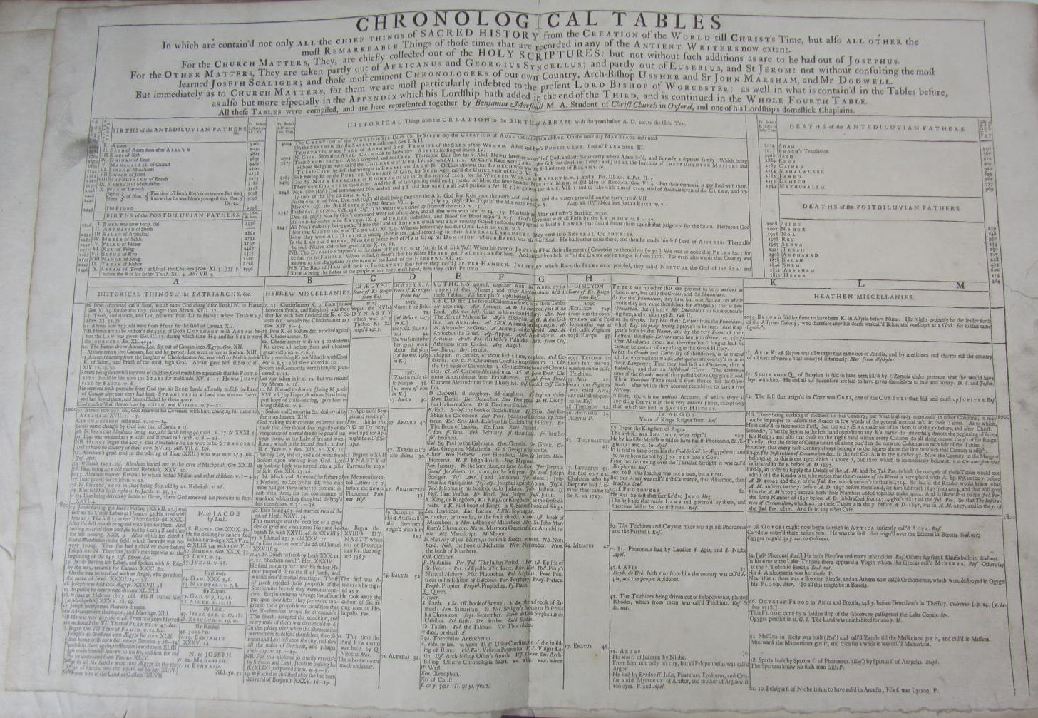Chronological tables in which are contain'd not only all the chief things of sacred history from the creation of the world 'till Christ's time. Oxford: Printed at the Theater, 1712-13. Large folio, 4 tables on 8 folding sheets, contemporary panelled calf, upper joint partly split, small tear to upper cover