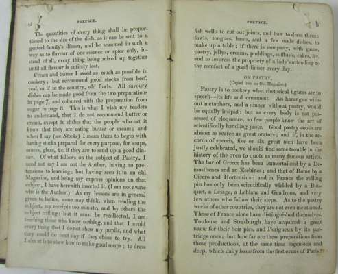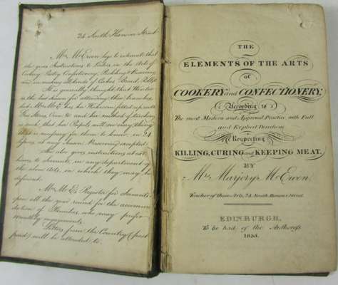 The elements of the arts of cookery and confectionery. Edinburgh: to be had of the authoress, 1835. First edition, 12mo, lithographed title and 2 plates, lithographed advertisement to front paste down, publisher's cloth, puncture mark top right corner to first 7 leaves affecting a few page numerals, a few spots and stains, hinges split, boards a bit soiled, board with small punture mark top right corner