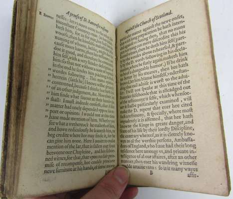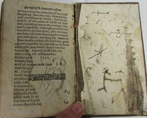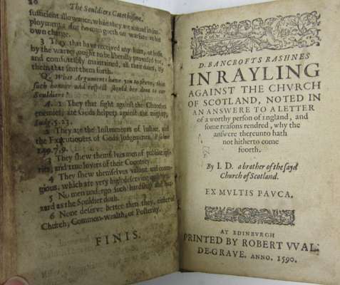The souldiers catechisme: composed for the parlaments army... [London:] J. Wright, 1644. 8vo, some soiling, notations to endpapers, cropped by binder without loss [ESTC R208219]; [bound with] [Davidson, John] D. Bancrofts rashnes in rayling against the Church of Scotland... Edinburgh: Robert Wal-de-Grave, 1590. 8vo, final leaf torn with loss [ESTC S120565]