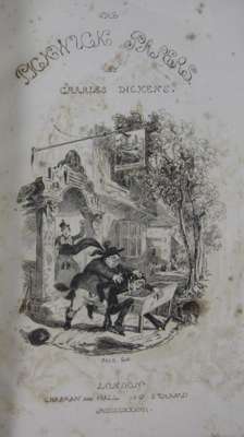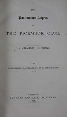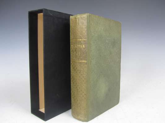The posthumous papers of the Pickwick Club. London: Chapman & Hall, 1837. First English book edition, mixed issue (with signature 'E' on p.25 and pagination on p.26, 'S. Veller' on p.342, frontispiece and vignette title-page in the first state, plates 1, 2 and 4 are the first state of the second Seymour plate, 3 is the second state of the first plate, 5-7 are the first state, 8 and 9 are the 'Phiz' plates, plates 12-13 and 17-21 are the first state, 10-11 and 14-15 the second state, 23-24 are the second plate, the remainder are first plates), 8vo, half title, etched frontispiece and vignette title-page and 41 other plates by Robert Seymour, R.W. Browne and H.K. Browne ('Phiz'), publisher's green cloth, covers embossed diagonally with alternating double rows of interlocking crescent devices and squares, "Pickwick Club" in gilt on spine, collector's black silk slipcase, contemporary inscription on half-title, some spotting and browning, neatly recased