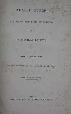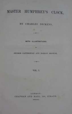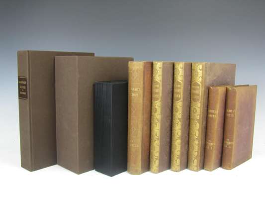 Master Humphrey’s Clock. Chapman & Hall, 1840-1841. 3 volumes, first book edition, primary binding, wood-engraved illustrations by George Cattermole, Hablot K. Browne, Samuel Williams and Daniel Maclise, publisher’s dark grayish brown bold-ribbed cloth ornately decorated in blind on both covers, upper covers with central design of clock in gilt (with hands pointing to relevant volume number), spines ornately gilt, cloth slipcase, covers slightly scuffed, spines faded and slightly bumped at head and foot [Eckel, pp.69-70; Smith I:6]; [Idem] Barnaby Rudge. Chapman & Hall, [1841]. 2 volumes, first separate edition, 8vo, later state (Smith, note 4), publisher's deep purple diamond-grained cloth, collector's cloth folding box, occasional slight spotting, joints slightly worn, repairs to spine at head, faded [Eckel, pp.67-70; Smith I:6B]; [Idem] American Notes. Chapman & Hall, 1842. 2 volumes, first edition, first issue, 8vo, with page x wrongly paginated xvi, reddish-brown vertically ribbed cloth (Smith's variant binding), Leighton & Erles' binder's ticket and bookseller's ticket on front fixed endpaper, black silk slipcase, edges slightly browned, covers slightly faded, corners bumped, spines faded and bumped at head and foot [Eckel, pp.108-9; Smith II:3]