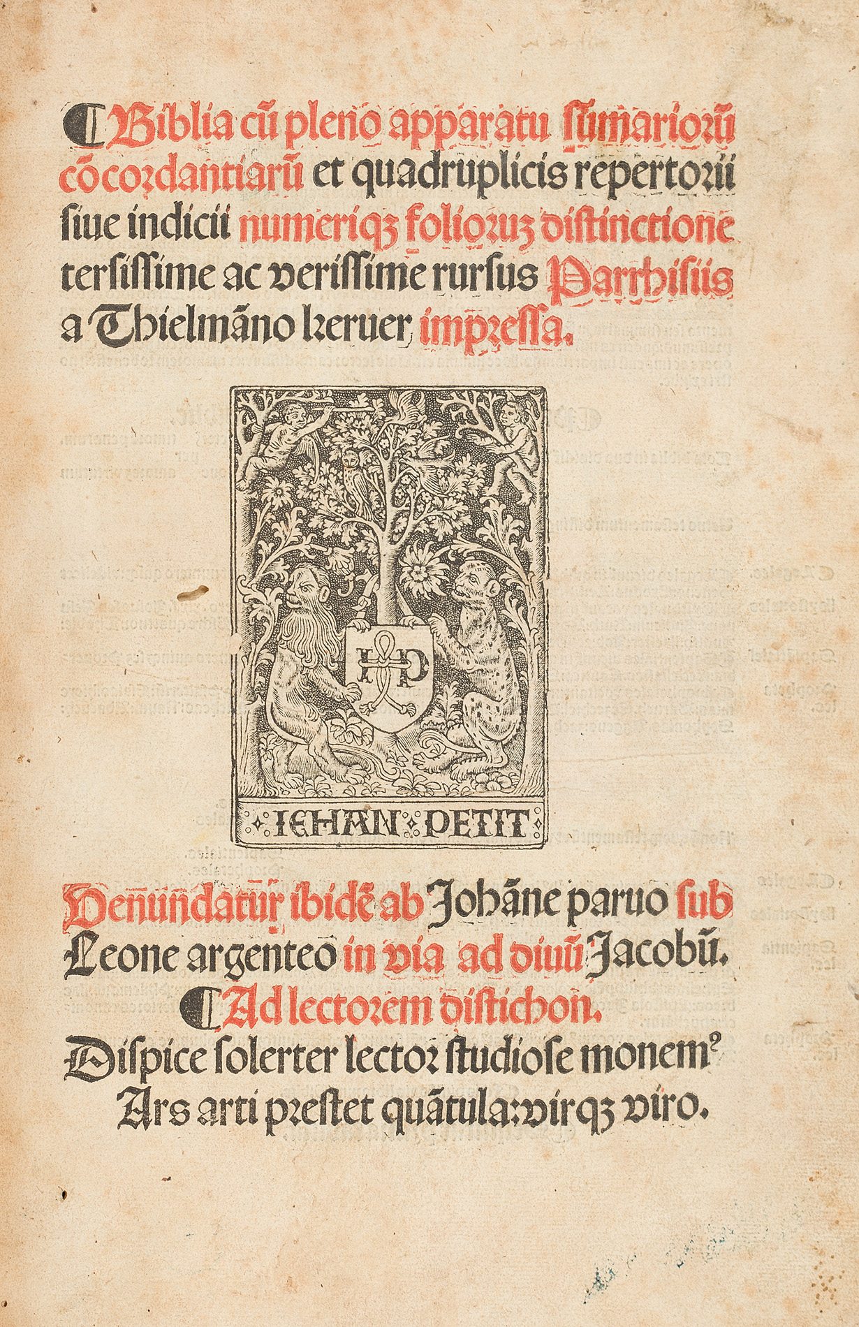 Biblia cum pleno apparatu sum[m]ariorum concordantiarum et quadruplicis repertorii. Paris: impressa Thielman Kerver, impensis Jean Petit & Jean Cabiller, 1504. Folio, title printed in red and black with Jean Petit's woodcut device, edited by Alberto Castellano, double column, black letter, woodcut on verso of B6 and verso of final leaf, contemporary blindstamped vellum over wooden boards, panels with floral motifs, standing figures and portraits in medallions, lacks A6-7 and a1-2, g8, h1, N1 and cc4-5, some marginal dampstaining, slight stain at y8 verso, joints a little split