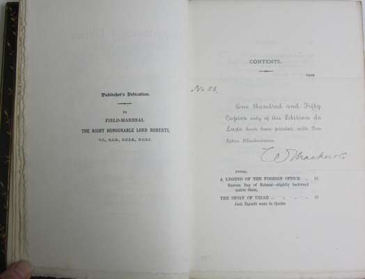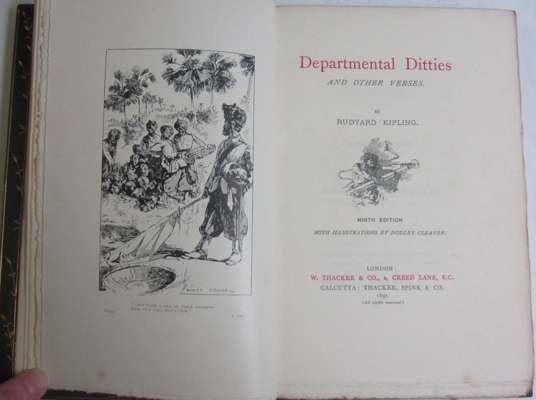 Departmental ditties, and other verses. London: W. Thacker & Co., 1897. 8vo, number 53 of 150 copies printed, 8 plates and other illustrations, green morocco gilt by Zaehnsdorf with gilt doublures over red silk endpapers, pencil gift inscription, very occasional light spotting, some fading and shallow, light markings to covers