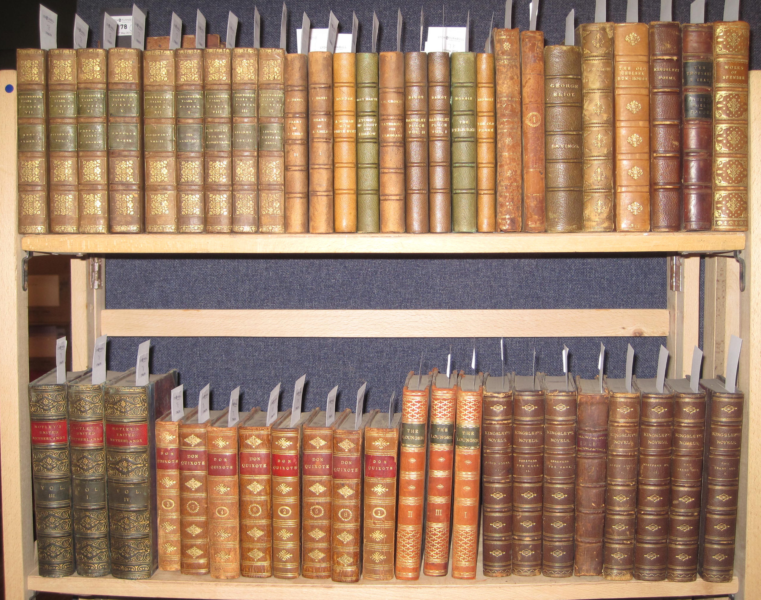 [Works]. 1881. 11 volumes, 8vo, brown half morocco; Cervantes Saavedra, M. de Don Quixhote. Madrid, 1788. [Works]. 8 volumes, 12mo, calf, rebacked, some dampstaining; [Mackenzie, H.D.] The lounger. 1787. 3 volumes, 12mo, half calf; and 38 volumes (60)