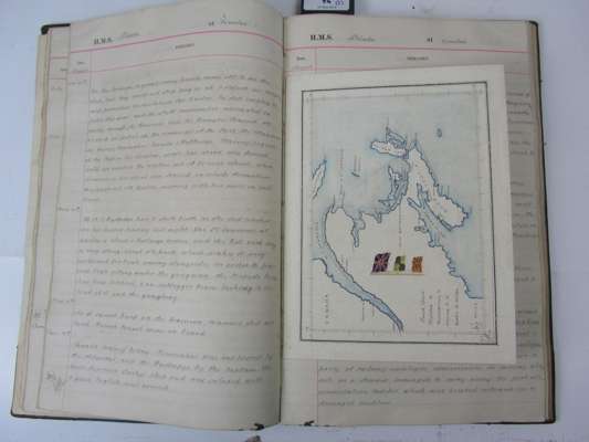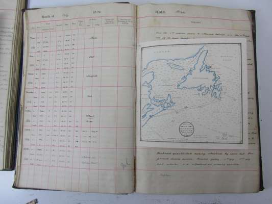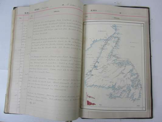 H.M.S. Blake represented Britain at the New York International [Naval] Review of April 1893, and the log contains three manuscript charts of the U.S. coast and a manuscript plan of New York, Brooklyn & New Jersey, a manuscript Signal from [U.S.] Admiral Hopkins, and a ms. chart of the naval ships attending. The majority of the logs detail journeys around Newfoundland and between and around Halifax and the West Indies.