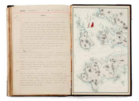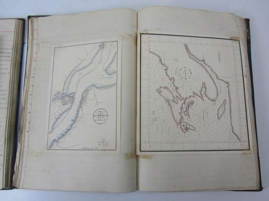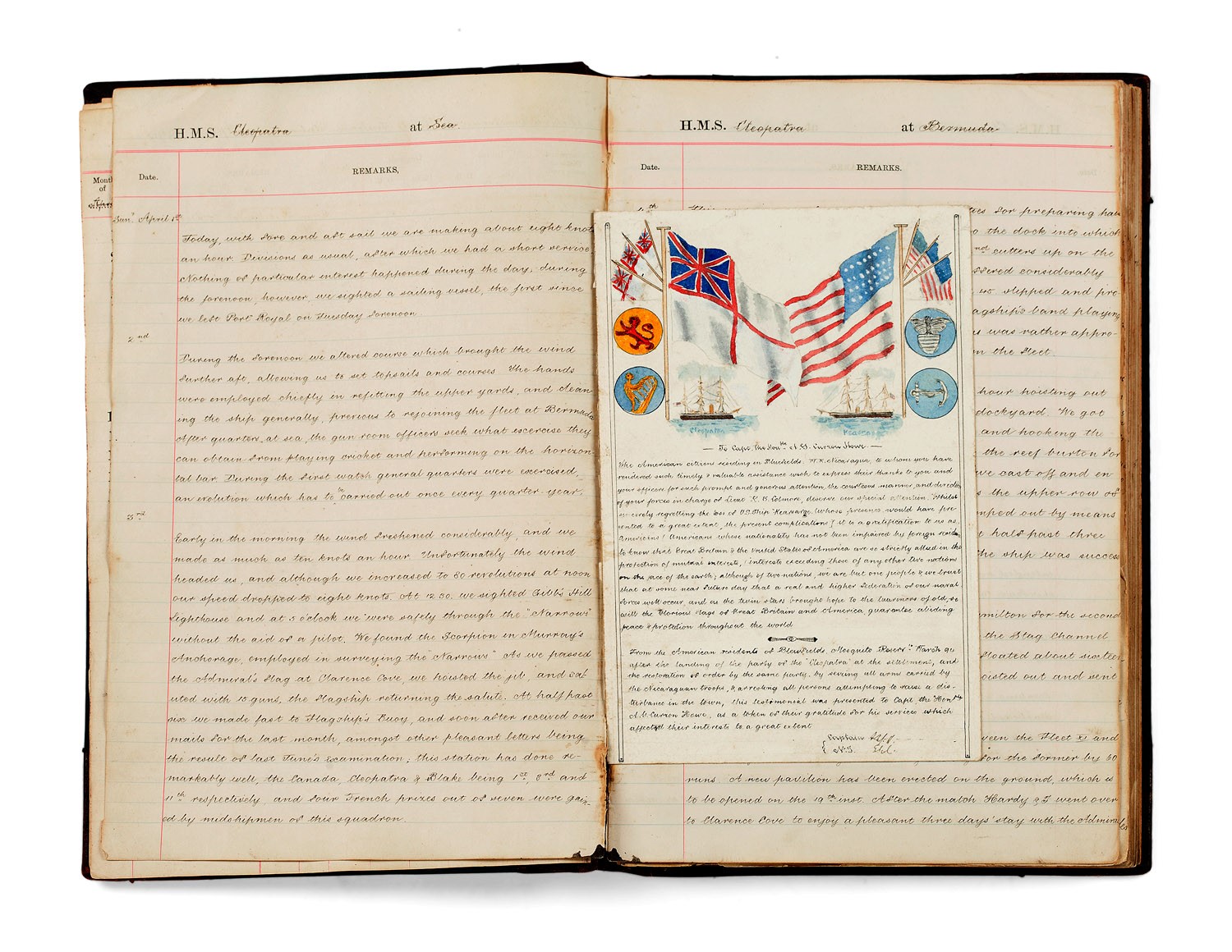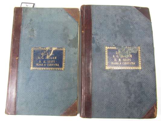 Naval log of AIan G. Hotham, Midshipman, H.M. Ships "Blake" & "Cleopatra", Feb. 3rd 1892 to 1st April 1894. 2 manuscript volumes, 4to, c.194 leaves, with 53 manuscript charts (17 of West Indies, 28 of Canada, 4 of the United States, 4 others), 2 watercolour profiles of H.M.S. Blake, 23 technical drawings of guns & equipment, 1 coastal drawing, 1 watercolour address, half morocco, bindings slightly marked, hinges of one volume a little weak