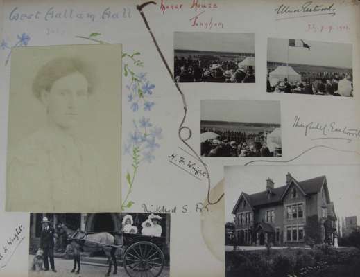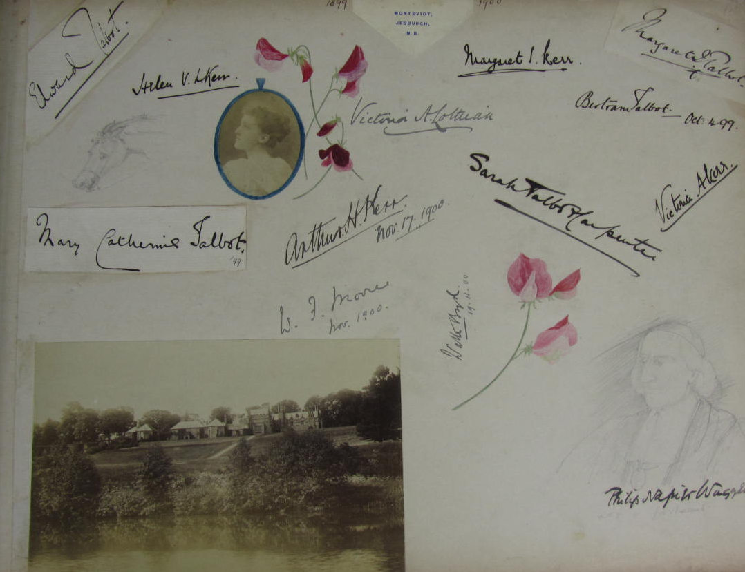 Scrapbook, 1899-1904, 50 pages including photographs, high-quality sketches, watercolours and signatures of the estate owners and their families from Lady Isobel Scott's tours to various country houses, such as Monteviot, Newbattle Abbey, Admiralty House (Devonport) and Douglas Castle, the album also tells of a trip to Dresden and shows 18 photographs of a visit to Iona in 1904