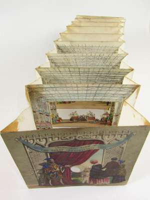 Lane's telescopic view of the interior of the Great Industrial Exhibition. London: C. Lane, 3rd June 1851. Peepshow with 10 hand-coloured lithographed panels including title, in concertina form, upper panel with a circular viewing hole, one image of fountain decorated with glitter, original slipcase with pictorial lithographed label, lacking perspex for viewing hole, slipcase somewhat soiled, repaired and worn