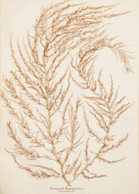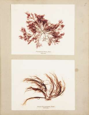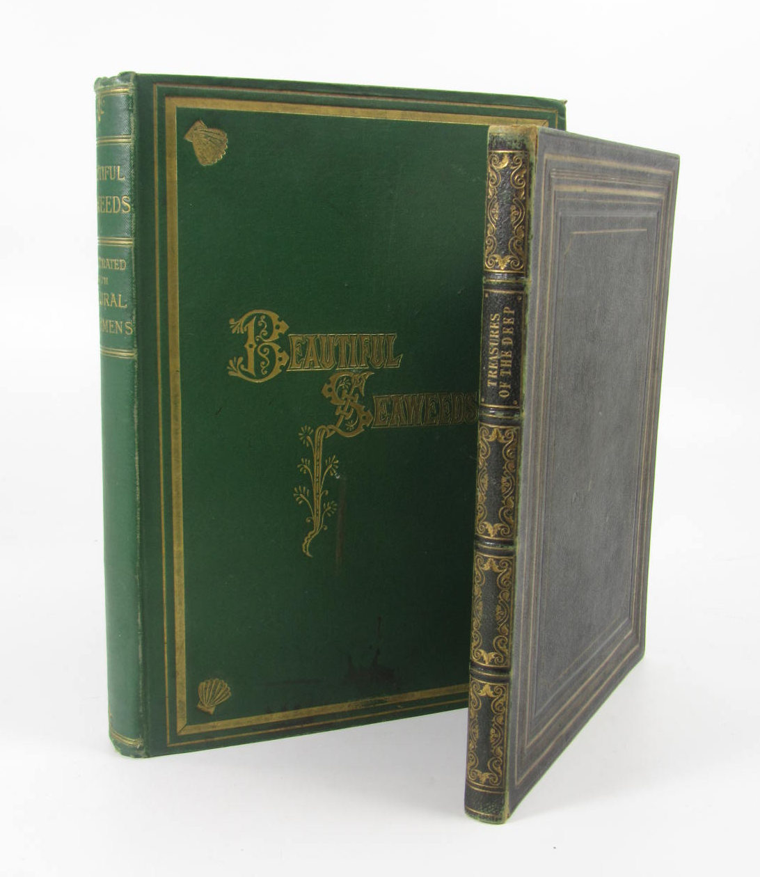 Beautiful Seaweeds illustrated by natural specimens. Paisley: J. & J. Cook, 1877 [1880 second issue of 30 copies]. Small 4to, title-page printed in red and black with small seaweed specimen vignette, decorative mounted seaweed specimen frontispiece and 40 mounted specimens, original green cloth gilt, a.e.g., some internal foxing and offsetting, a little rubbing and soiling to covers, some cocking; Seaweed specimen album bound into covers of Treasures of the deep [Glasgow: David Bryce, 1847] 56 mounted seaweed specimens with typed labels and a further 31 mounted specimens with no labels or manuscript labels, some loose, black morocco gilt, title-page lacking, some offsetting, foxing and rubbing; Bryce, David Treasures of the deep... Glasgow: David Bryce, 1847. Over 57 mounted seaweed specimens, manuscript index, original red cloth gilt very worn (3)