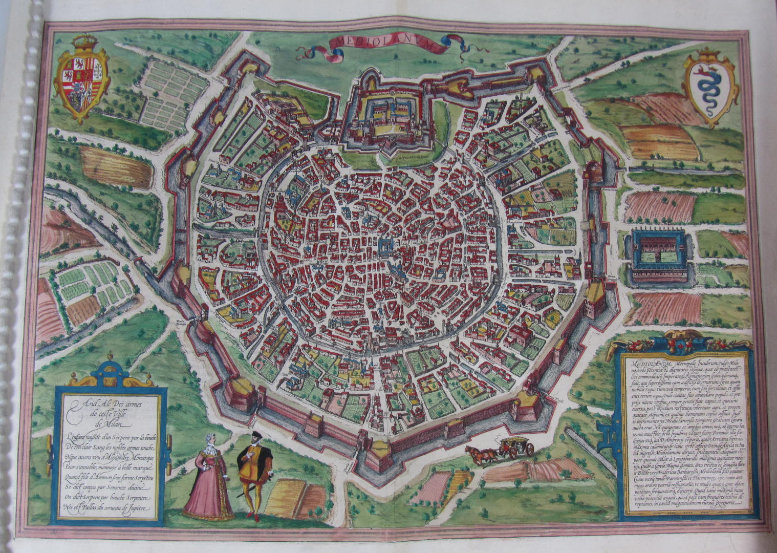 Mediolanum. [Amsterdam or Cologne, after 1572], rolled engraving, later hand-colouring, 39.5x52cm, Latin text to verso, small closed tear and a few neat repairs