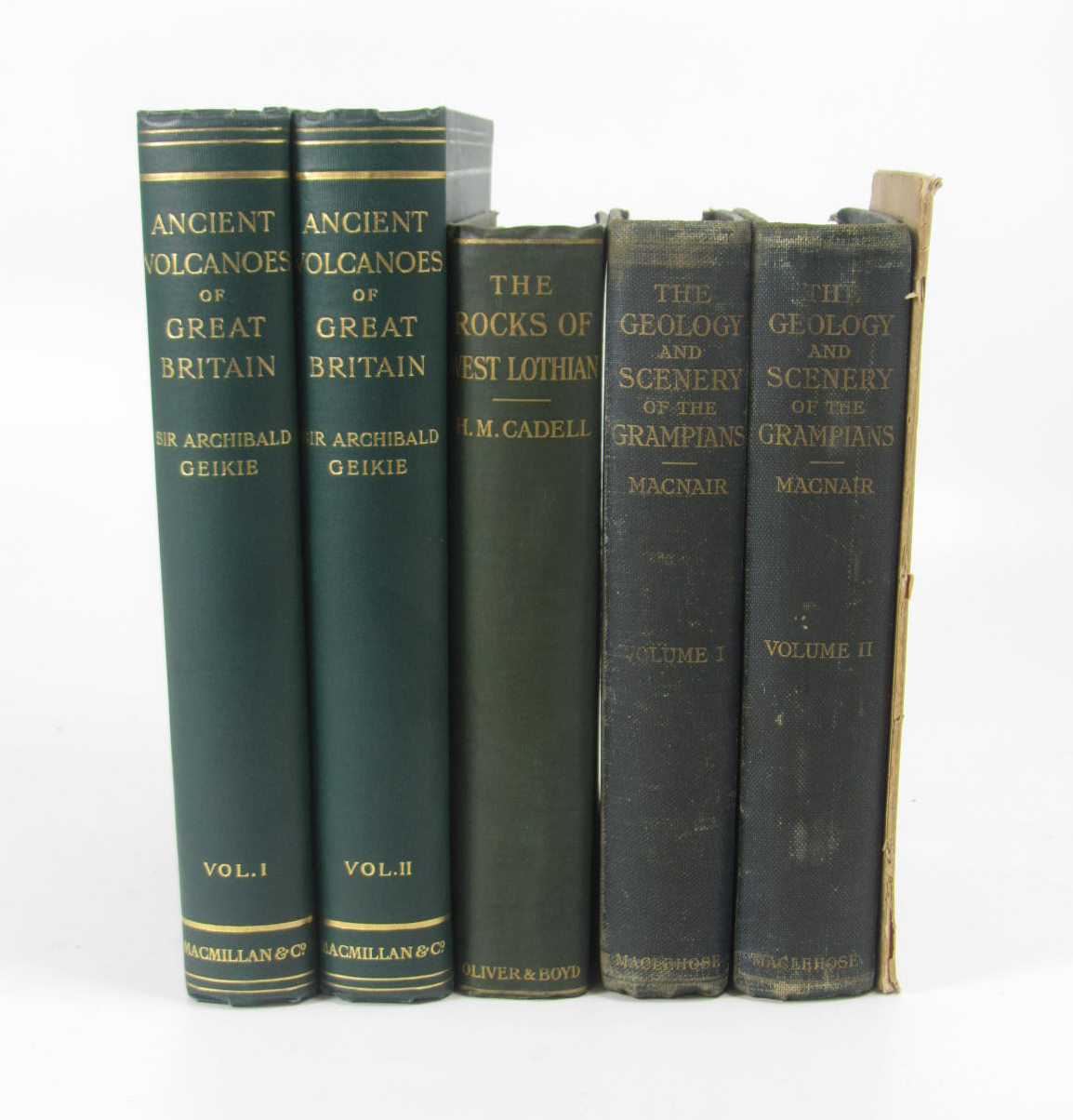 The ancient volcanoes of Great Britain. London: Macmillan and Co., 1897. 2 volumes, 8vo, 7 folding maps, original green cloth gilt, ownership inscription to endpaper, occasional light foxing; Cadell, Henry M. The rocks of West Lothian. Edinburgh: Oliver and Boyd, 1925. 8vo, publisher's green cloth gilt, plates, folding map; Macnair, Peter The geology and scenery of the Grampians and the valley of Strathmore. Glasgow: James Maclehose and Sons, 1908. 2 volumes, 8vo, publisher's blue cloth gilt, some spotting, rubbing; Peach, B.N Description of Arthur's Seat volcano. Edinburgh: HMSO/Geological Survey Scotland, 1911. 8vo, original wrappers, tear to lower cover with some loss to text; Richey, J.E. Scotland: the tertiary volcanic districts. Edinburgh: HMSO, 1961. 8vo (7)