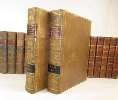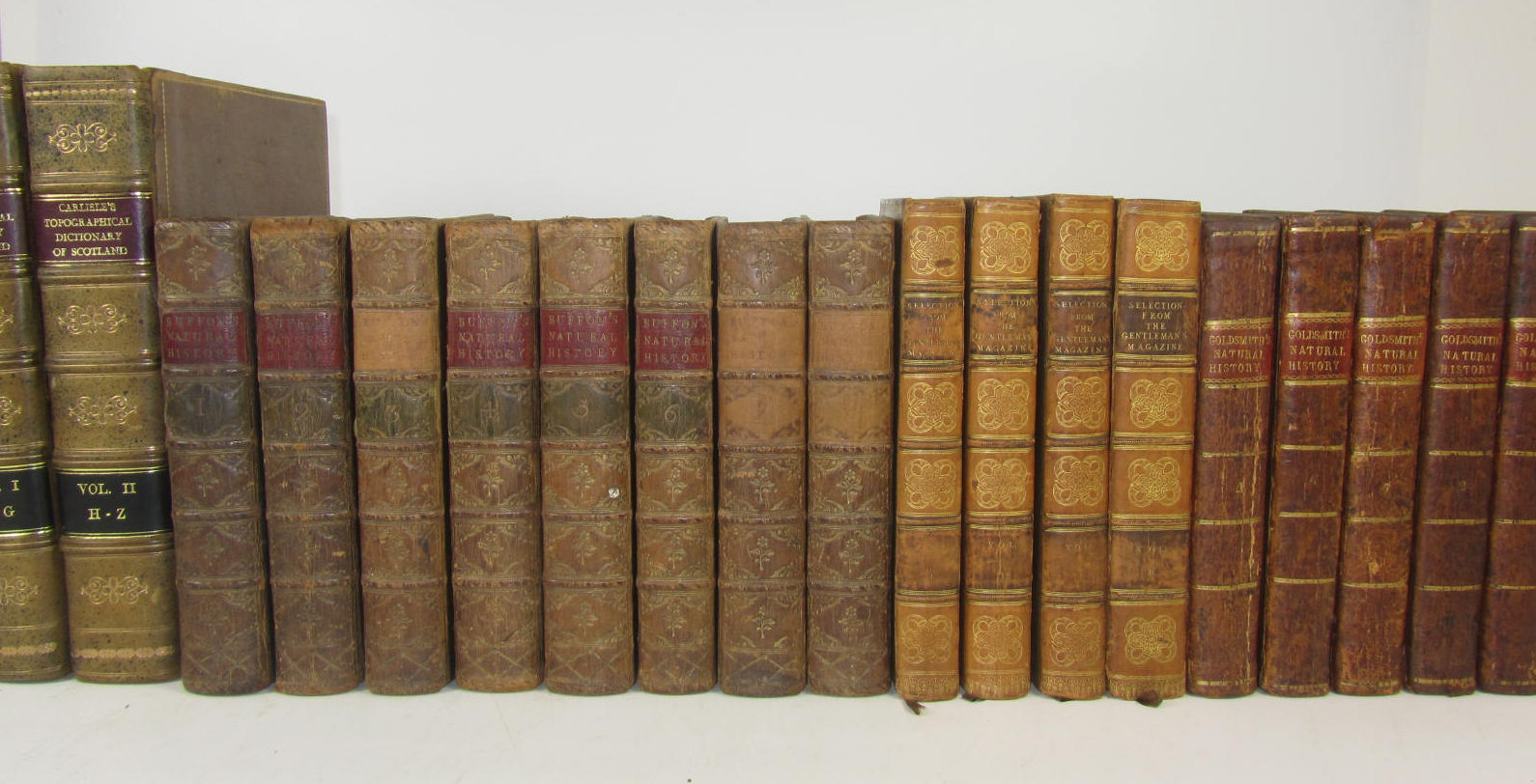 A topographical dictionary of Scotland. London, 1813. 2 vol., 4to, calf gilt, neatly rebacked; Buffon, G.L.M., comte de Natural history. Edinburgh: W. Creech, 1780, 8 vol., plates, contemporary calf, a few plates torn and/or repaired, lacks a few labels; Buffon, comte de Natural history. Edinburgh: W. Creech, 1780. 8 vol., plates, half calf, worn, a few boards detached; Goldsmith, O. An history of the earth and animated nature. 1774. Volumes 2-6 (of 8), plates, calf; Gentlemen's Magazine, A selection of curious articles from. 1809-11. 4 vol., 8vo, calf gilt; sold not subject to return (27)