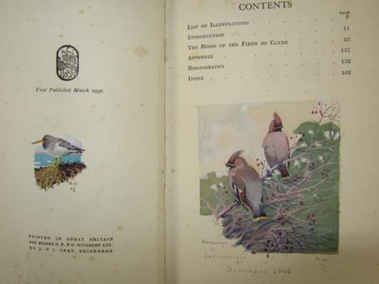 The geese of Europe and Asia. 1905. 4to, frontispiece & 24 chromolithographed plates, original cloth, ex-library copy with small stamp to each plate; McWilliam, J.M. The birds of the Firth of Clyde. 1936, the artist Donald Watson's copy with 4 original watercolours at beginning, blue morocco gilt; Gladstone, H.S. The birds of Dumfriesshire. 1910, cloth, dustwrapper; Butler, A.G. British birds' eggs. [N.D.], chromolithographed plates, cloth; Gray, R. The birds of the West of Scotland including the Outer Hebrides. 1871, A. Kirk Mackie's copy with note about R. Gray, plates, cloth, slightly rubbed; Graham, H.D. The birds of Iona & Mull. 1890, cloth, spine faded; Nash, J.K. The birds of Midlothian. 1935, cloth; McWilliam, J.M. The birds of the Island of Bute. 1927, cloth; Dixon, C. Among the birds in Northern shires. 1900, cloth; Harting, J.E. A handbook of British birds. 1872, cloth; McWilliam, J.M. The birds of the Firth of Clyde. 1936, cloth, dustwrapper; Salvin, O. A catalogue of the collection of birds formed by the late H.E. Strickland. 1882, cloth, joint split; Selby, P.J. Illustrations of British ornithology. 1833. 2 vol., 8vo, only, cloth; Paton, E.R. & O.G. Pike. The birds of Ayrshire. 1929, cloth; Bruce, G. The Land birds in and around St. Andrews. 1895, cloth; and 9 others; sold not subject to return (25)
