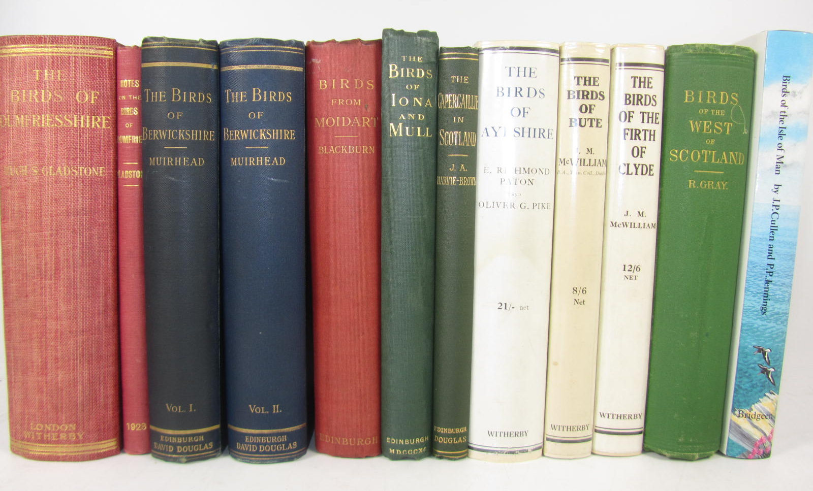 The great Auk, or garefowl. 1885. 4to, folding map and 4 plates (2 coloured), original cloth; Fuller, E. The great Auk. 1999. 4to, number 32 of 400 signed copies, green half morocco gilt, slipcase; Gladstone, H.S. The birds of Dumfriesshire. 1910, cloth; Notes on the birds of Dumfriesshire. 1923, cloth; Muirhead, G. The birds of Berwickshire. 1889. 2 vol., cloth; Blackburn, H. Birds from Moidart and elsewhere. 1895, cloth, frontispiece loose; Graham, H.D. The birds of Iona & Mull. 1890, cloth; Harvie-Brown, J.A. The capercaillie in Scotland. 1888, cloth; Paton, E.R. The birds of Ayrshire. 1929, cloth, dustwrapper; McWilliam, J.M. The birds of the island of Bute. 1927, cloth, dustwrapper; McWilliam, J.M. The birds of the Firth of Clyde. 1936, presentation copy, cloth, dustwrapper; Gray, R. The birds of the West of Scotland including the Outer Hebrides. 1871, cloth; Graham, H.D. The birds of the Iona & Mull. 1890, cloth; Patterson, R.L. The birds, fishes and cetacea commonly frequenting Belfast Lough. 1880, cloth; Seebohm, H. The birds of Siberia. 1901, cloth, rubbed; Swaysland, W. Familiar wild birds, illustrated, n.d,, 1883-88?] 80 original parts, parts 1-76 in original wrappers; and 6 others; sold not subject to return (102)