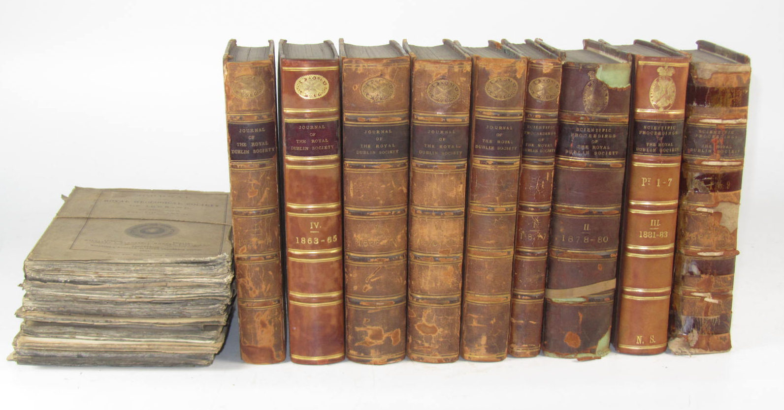 Scientific proceedings. Dublin, 1878-1898. Volumes 1-8 of the new series, 8vo, half calf gilt, Royal Society of Edinburgh stamps, many covers detached; [Idem] The journal. Dublin: Hodges, Smith, & Co., 1858-1878. Volumes 1-7, 8vo, half calf with Royal Society of Scotland gilt stamps, many covers detached and worn; Royal Geological Society of Ireland Journal. London, Dublin & Edinburgh, 1867-1887. Volumes 1 & 5 (half calf) and 2, 3, 4, 7 & 8 incomplete and in parts only, Royal Society of Edinburgh stamps; sold not subject to return