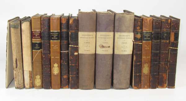 The Edinburgh journal of science. London: Edward Lumley, 1826-1829. Volumes 3, 4, 6, 7, 8, 9 & 10 only, 8vo, half calf, stamps of Bethesda Library and the Royal Society of Edinburgh, many covers rubbed and detached; The Edinburgh journal of science, new series. Edinburgh: Thomas Clark, 1829-32. 6 volumes in 3, purple cloth with paper labels to spines; duplicates of new series volumes 1-4 & 6, 8vo, half calf, Royal Society of Edinburgh stamps, some covers rubbed and detached; sold not subject to return (15)