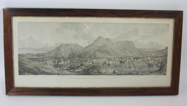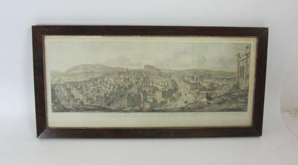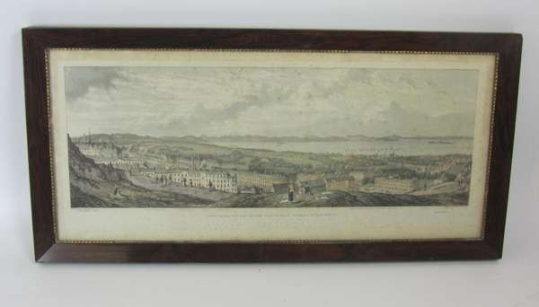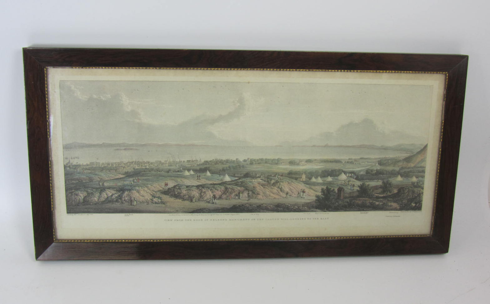 The city of Edinburgh taken from the Calton Hill - four panoramic views of Edinburgh. Edinburgh: William Fairborn, 1823, cropped to c.250x622mm each, hand-coloured, framed and glazed, comprising: View from the top of the Calton Hill, looking to the North, View from the door of Nelson's monument on the Calton Hill, looking to the East, View from the walk on the top of the Calton Hill, looking to the South, View from the top of the Calton Hill by Nelson's monument, looking to the West; all laid-down, some foxing and small discreet repairs; and 2 others (6)