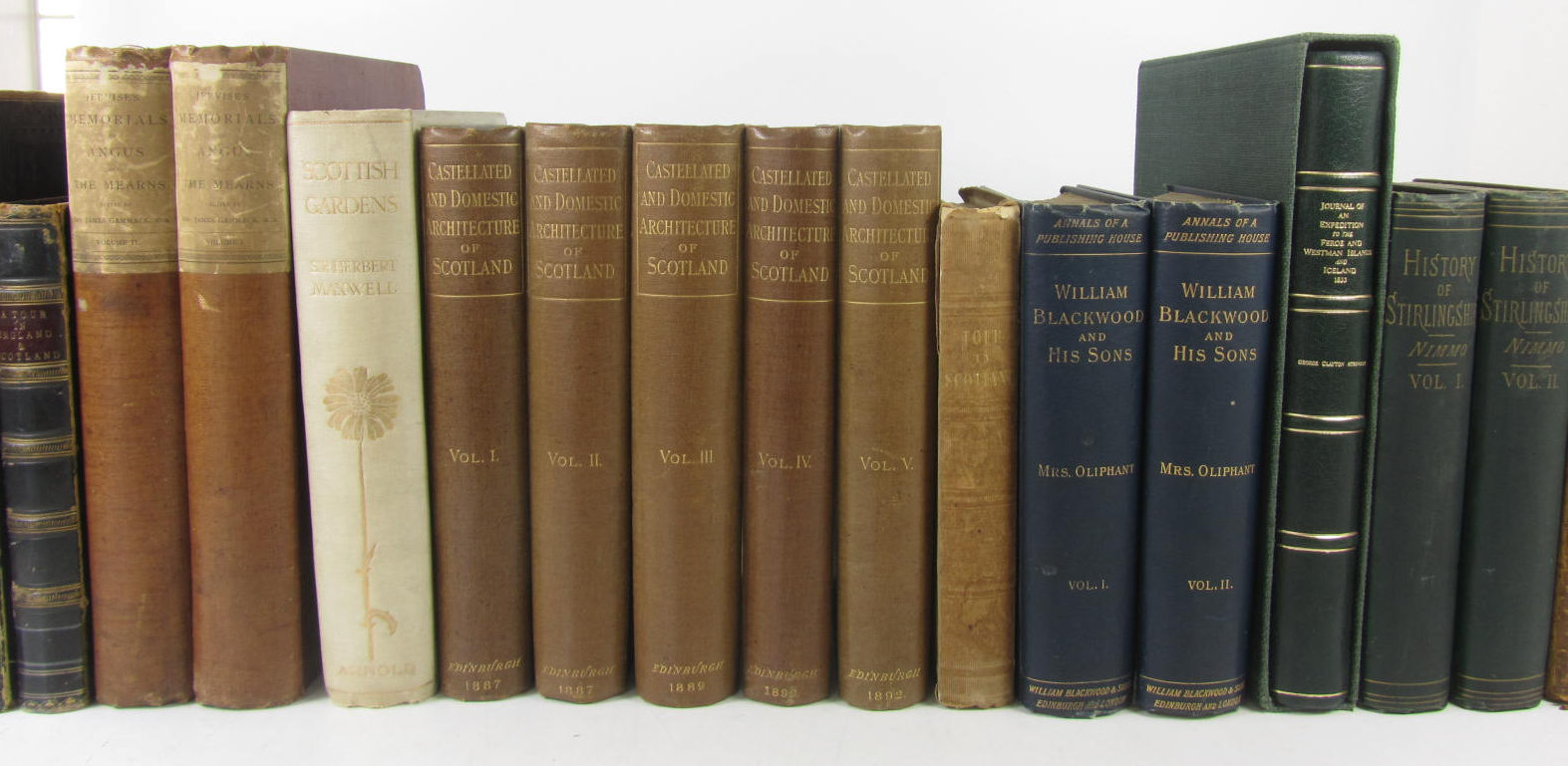 Memorials of Angus and Mearns. 1885. 2 vol., number 33 of 60 copies on large paper, plates, original buckram, uncut, slightly rubbed; Maxwell, H. Scottish gardens. 1908. 4to, no. 82 of 250 copies, plates, original pictorial buckram, t..e.g.; T.H.C. A descriptive tour in Scotland. 1840, lithographed plates, original cloth, hinge broken, rubbed; Oliphant, Mrs William Blackwood and his Sons. 1897. 2 vol., original cloth; Nimmo, W. The history of Stirlingshire. 1880. 2 vol., original cloth; MacGibbon, D. & T. Ross The castellated and domestic architecture of Scotland. 1887. 5 vol., original pictorial cloth gilt, t.e.g.; Atkinson, G.C. Journal of an expedition to the Feroe and Westman Islands and Iceland. 1989. 4to, number 499 of 875 copies signed by the editor, morocco-backed boards, t.e.g., slipcase; Monteath, Robert The forester's guide. 1824, half calf, rubbed; [Thomson, William] A tour in England and Scotland, in 1785, plates, half calf, hinge broken, rubbed; and a quantity of miscellaneous books; sold not subject to return (quantity)