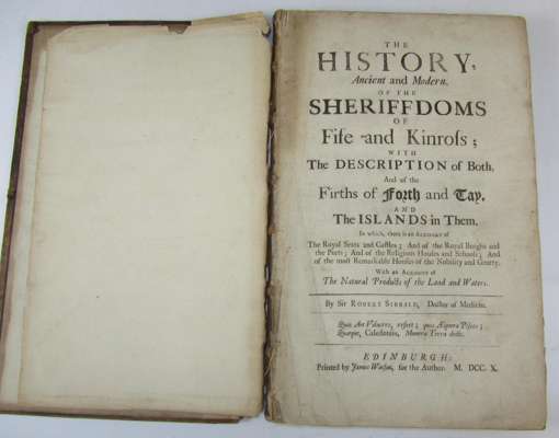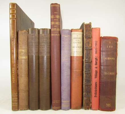 The history, ancient and modern, of the shefiffdoms of Fife and Kinross. Edinburgh 1710. Folio, lacks plate; Sibbald, R. Historical inquiries [extracted from A Collection of Several Treatises in Folio concerning Scotland]. Edinburgh, 1707. Folio, map and 6 plates. Maclagan, C. The hill fort, stone circles and other structural remains of ancient Scotland. 1875. Folio, plates, original cloth; Browne, G.F. On some antiquities in the neighbourhood of Dunecht House Aberdeenshire. 1921. 4to, cloth, spine faded; Campbell, Alexander A journey from Edinburgh through parts of North Britain. 1802. 2 volumes, 4to, 43 sepia aquatint plates, buckram-backed boards, uncut; Greenshields, J.B. Annals of the parish of Lesmahagow. 1864. 4to, 7 (of 8) plates, original cloth, rubbed; Houses of Parliament Scotland. Owners of lands and heritages. 1874. Folio, half calf, Metcalfe, W.M. A history of the county of Renfrew. Paisley, 1905. 4to, map, original cloth slightly soiled; M'Callum, A. Pollokshaws village & burgh 1600-1912. Paisley, 1925; and a very poor copy of Chalmers' Caledonia; and a few others; sold not subject to return (14)