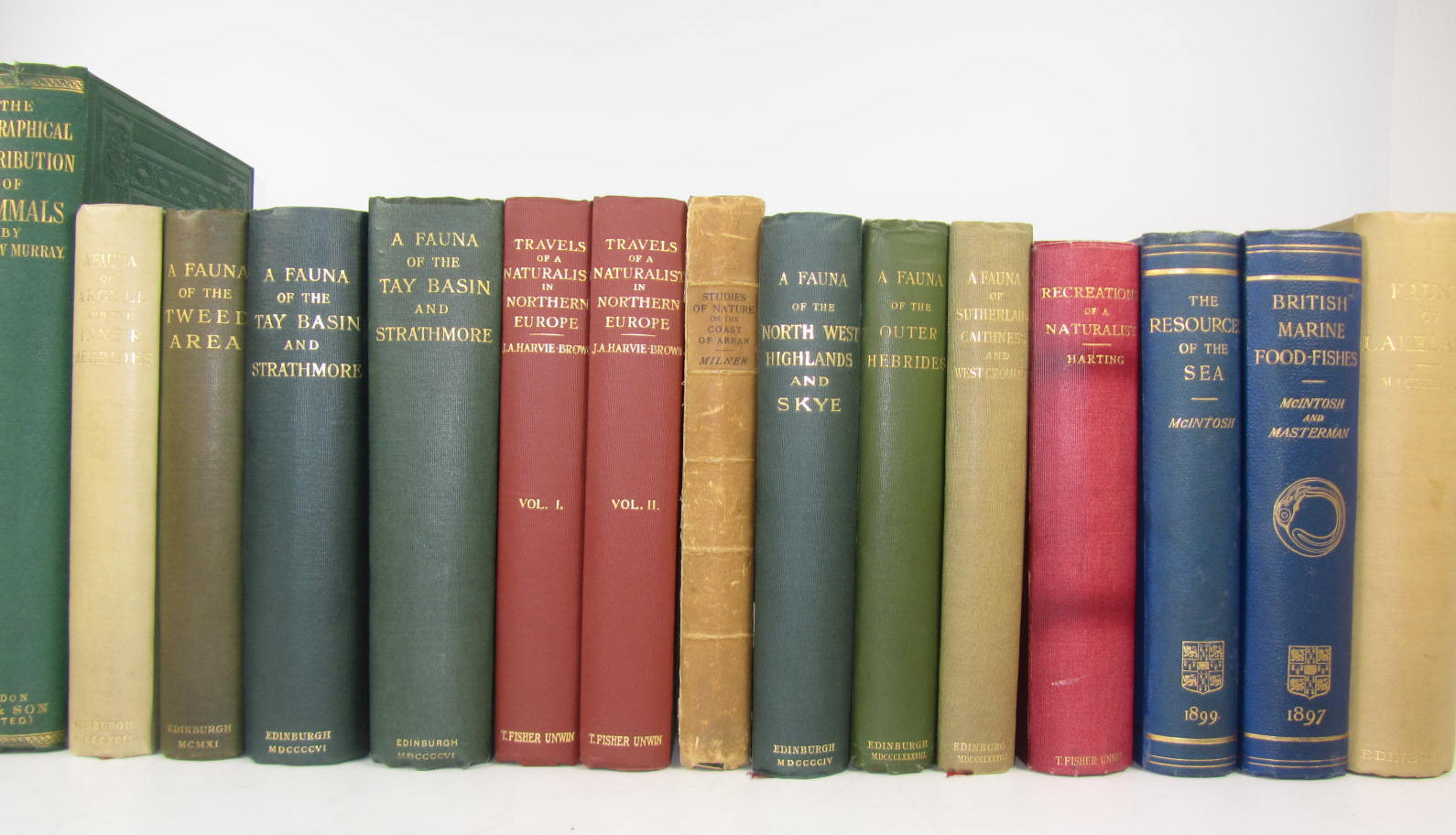 The geographical distribution of mammals. 1866. 4to, frontispiece, coloured maps, cloth; Harvie-Brown, J.A. & H.A. Macpherson A fauna of the N.W. Highlands and Skye. 1904, cloth; Harvie-Brown, J.A. A vertebrate fauna of the outer Hebrides. 1888, cloth; [Idem] A vertebrate fauna of Sutherland, Caithness and West Cromarty.1887, cloth, spine faded; Harvie-Brown, J.A. A fauna of the Tay basin & Strathmore. 1906, 2 copies, cloth; Evans, A.H. A fauna of the Tweed area. 1911, cloth, spine slightly faded; Harvie-Brown, J.A. Travels of a naturalist in Northern Europe. [N.d.], 2 vol., cloth gilt, t.e.g.; Milner, G. Studies of nature on the coast of Arran. 1894. No.17 of 75 large paper copies, boards, uncut, binding soiled; McIntosh, W.C. The resources of the sea. 1899, cloth gilt; McIntosh, W.C. The life histories of the British marine food-fishes. 1897, cloth gilt; Macpherson, H.A. A vertebrate fauna of Lakeland. 1892, cloth, spine faded; Harting, J.E. Recreations of a naturalist. 1906, cloth; [Knapp, J.L.] The journal of a naturalist. 1829. 7 engraved plates, half calf, worn, joint split; Bell, T. A history of British quadrupeds. 1837, cloth; Sim, G. The vertebrate fauna of Dee. 1903, cloth; and 22 others, natural history; sold not subject to return (27)