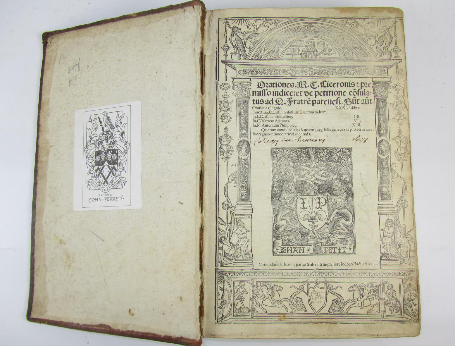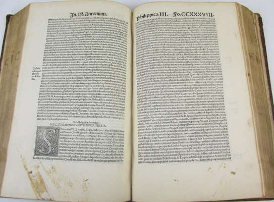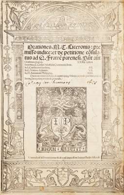 Orationes. [Paris]: venundantur Josse Bade, 1511. Folio, [ff. 6], 262, title within woodcut border, [ USTC 187193], pointillé initial letters, neatline of fore-margin title shaved, a few wormholes, occasionally affecting text, some stains, title torn; [bound with] Cicero, M.T. Opera epistolica. [Paris]: Venundantur... Josse Bade, [1511]. Folio, [ff. 11], 181, title within woodcut border, a few wormholes affecting text, later calf, very worn