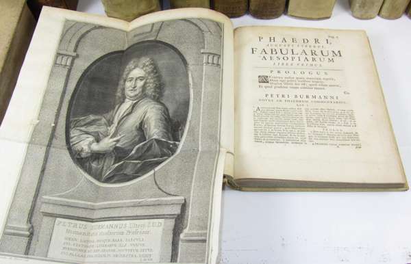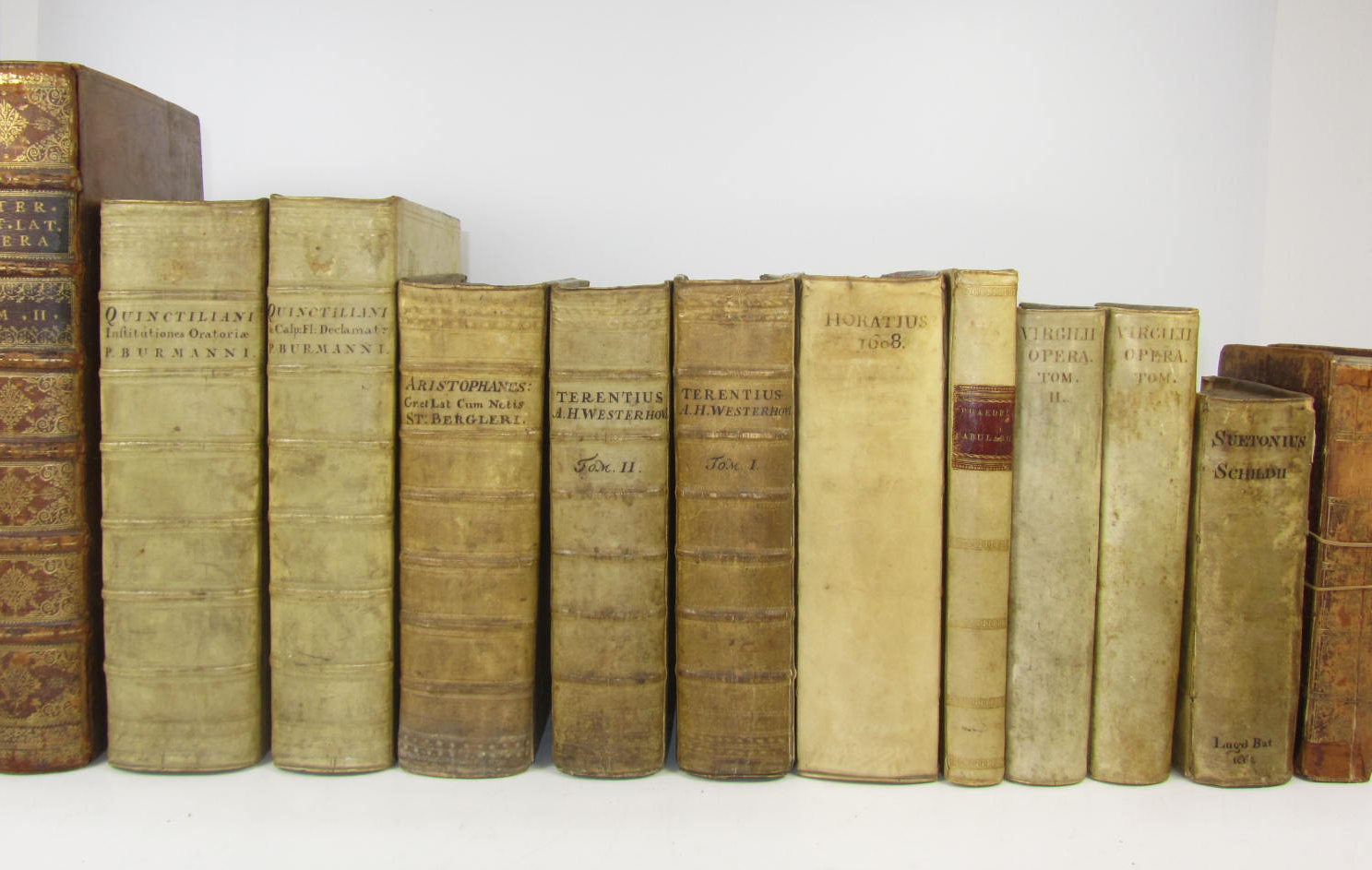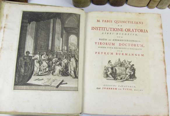 De institutione oratoria. Leiden: J. de Vivie, 1720. 4to, title printed in red and black, title vignette, frontispiece, contemporary blindstamped vellum; Idem Declamationes IXI majores. Leiden: J. de Vivie, 1720. 4to, title vignette, contemporary blindstamped vellum; Aristophanes Comoediae undecim, Graece & Latine. Leiden: S. & J. Luchtmans, 1760. 2 vol. in one, 4to, contemporary blindstamped vellum, Terentius Afer, P. Comoediae sex. The Hague: P. Cosse, 1726. 2 vol., 4to, titles printed in red and black, frontispieces, contemporary blindstamped vellum, bindings slightly soiled, 2 hinges cracking; Horatius Flaccus,Q. [Opera] cum erudito Laevini Torrentii. Antwerp: J. Moret, 1608. 4to, engraved title vignette, contemporary blindstamped vellum, a few initial letters coloured, ownership inscription erased from title; Phaedrus Fabularum Aesopiarum.. num commentario Petri Burmanni. Leiden, 1727. 4to, folding portrait, contemporary vellum, lacks engraved title, some discolouration; Vergilius Maro, P. Bucolica, Georgica et Aeneis. London: J. & P. Knapton, G. Sandby, 1750. 2 vol., 8vo, 57 plates (?complete, no plate no. 2 called for), contemporary vellum; Hutton, W. A history of Birmingham. 1783. 8vo, 19 plates and plans, lacks Prospect & 1 plate but with duplicate folding plan, calf, worn, cover detached; and 5 other vol., classics (15)