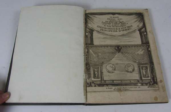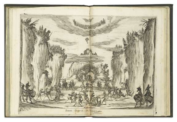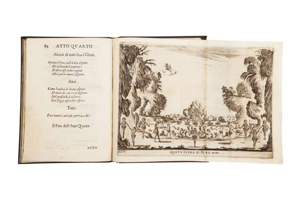 Le nozze degli dei, favola... Florence: Amadore Massi & Lorenzo Landi, 1637. 4to (226 x 162mm), engraved title and 7 double-page engraved plates of the scenes (by Stefano della Bella after Alfonso Parigi), woodcut head-pieces and initials, nineteenth-century quarter calf, 2 plates rebound as folding plates (with slight loss to repairs on verso), minor loss to title at hinge and two small holes, repair to A2, some foxing to margins and browning to title, lower hinge broken [Watanabe-O'Kelly & Simon 1285; Sonneck (opera librettos), p.806; The New Grove ix, 4; The New Grove Dictionary of Opera 3, 855]