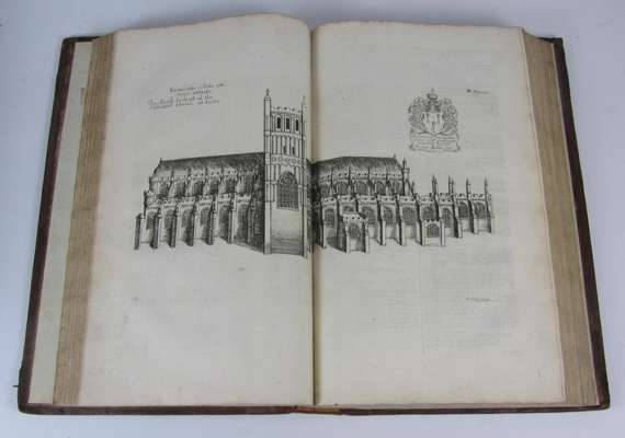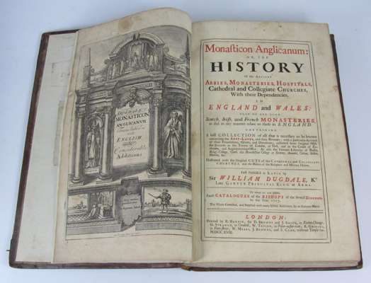 Monasticon Anglicanum... London: R. Harbin, D. Browne and J. Smith, 1718. Folio, 3 volumes in one, engraved title, title-page in red and black and 102 engraved plates by W. Hollar, T. Johnson, S. Anderton and others, contemporary panelled calf, rebacked, bookplates, some browning and darkening to titles, hole to p.287 with loss to some letters, closed tear to Eton College plate [ESTC T149944]