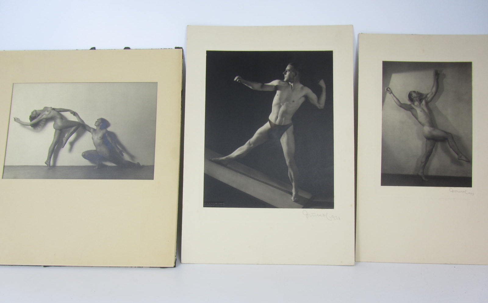 2 photographs of male nudes, signed and dated 1931 and 1933, c.23 x 16cm., female nude signed and dated, 1930, 29 x 23cm.; two nude female dancers, signed and dated 1932, 19 x 28cm., three with photographer's blindstamp, all mounted on card (4)