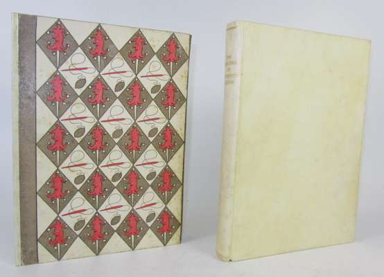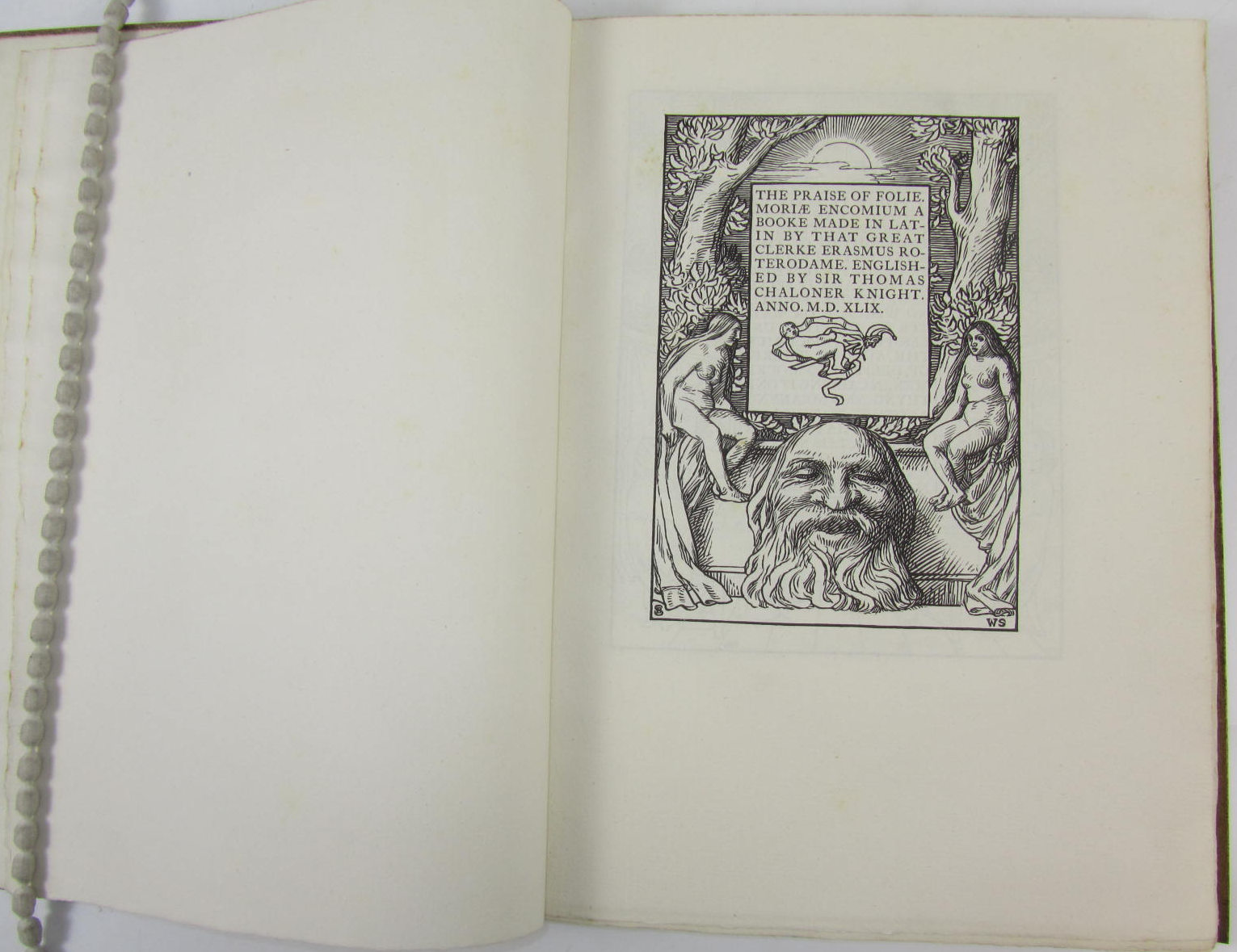 The treatises... on goldsmithing and sculpture. London: E. Arnold, Printed by C.R. Ashbee at the Guild's Press at Essex House, 1898. 4to, number 203 of 600 copies, 11 plates, contemporary vellum gilt, others uncut, faint traces of a few discreetly removed library stamps; Erasmus, Desiderius The praise of folly. Essex House Press, 1901. First edition, 4to, number 249 of 250 copies, woodcuts and borders designed by William Strang and cut by B. Sleigh, original pictorial vellum, uncut, binding slightly spotted (2)