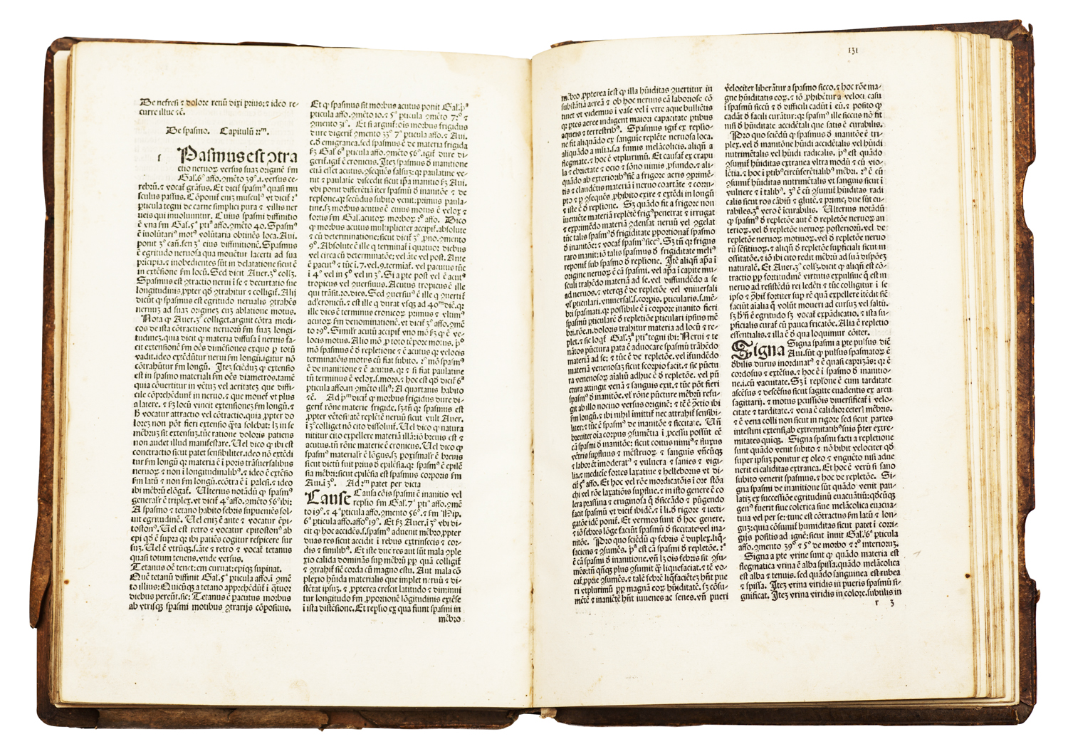 Rosa anglica practica medicine a capite ad pedes [edited by Nicholas Scyllatius]. Pavia: joannes Antonius Biretta and Fransiscus Girardengus, 24 January 1492. Chancery folio (275 x 190mm.), 174 leaves (of 178), *4 a-x8 y6, double column, 54 lines plus printed foliation, Gothic letter, 2- to 8-line initial spaces with printed guides, woodcut printer's device beneath colophon, contemporary German blind-stamped pigskin over wooden boards, lacking e2, e7-8 (all supplied in facsimile) and blank y6, first leaf slightly soiled and torn without loss, pigskin soiled and torn with some loss, lacking two clasps [HC 1108; BMC vii 1005; Eimas 104; Klebs 424.1; Wellcome 2485; Goff J326]