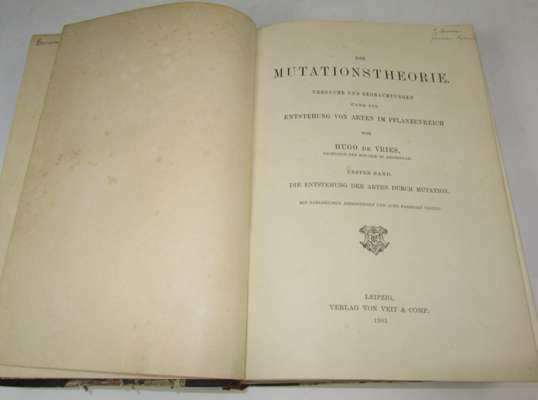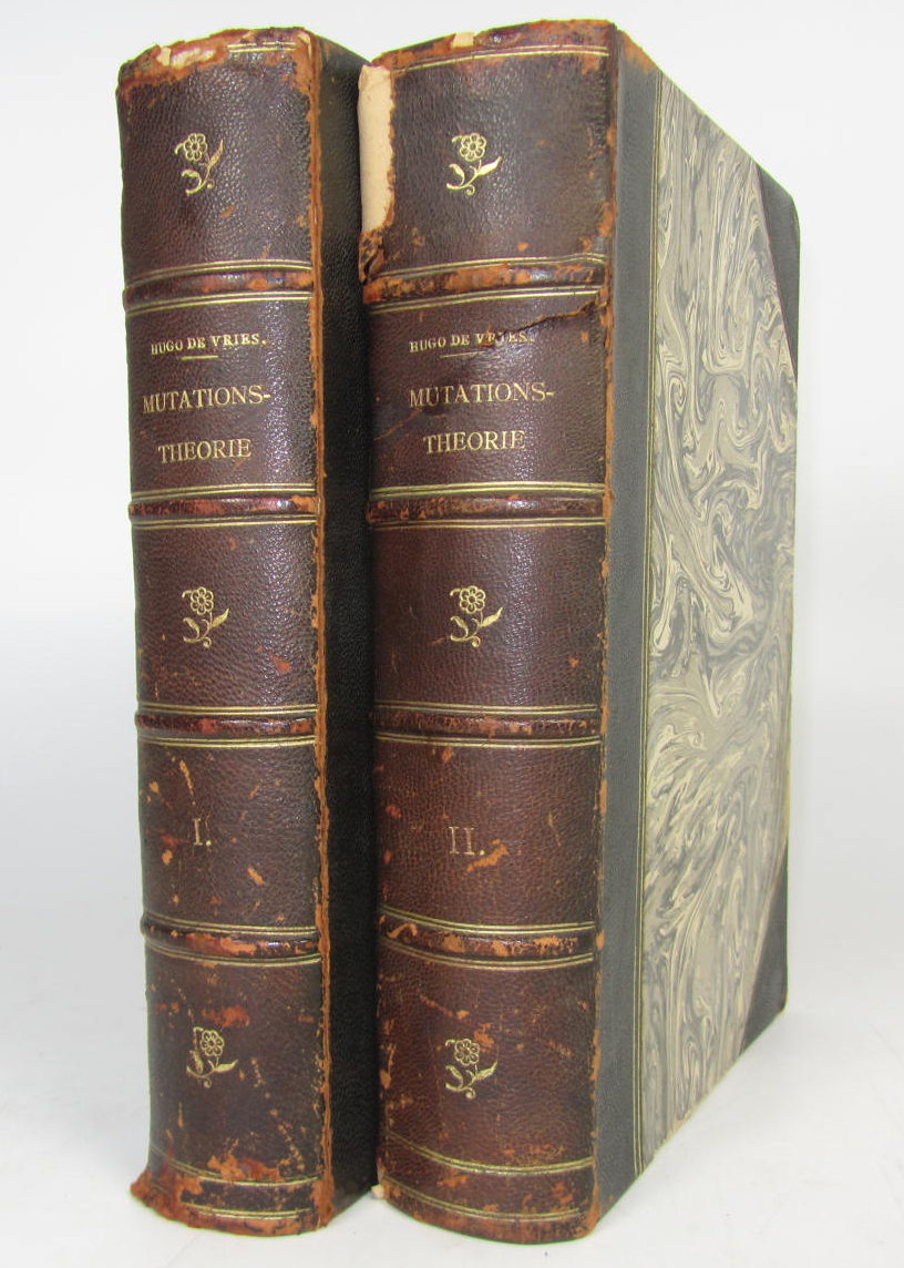 Die mutationstheorie. Leipzig: Veit & Comp., 1901-03. First edition, 2 volumes, 8vo, 12 chromolithographed plates, contemporary brown half morocco, rubbed, Arpad Plesch copy with leather book-label