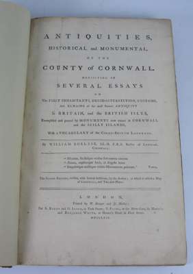Antiquities historical and monumental of the county of Cornwall. London: S. Baker..., 1769. Second edition, folio, 27 maps and plates, contemporary gilt tooled calf rebacked with segmented gilt tooled spine, bookplate, lacks final leaf (pp.463-4), tear to the margin of plate 16