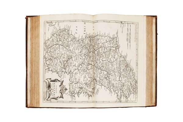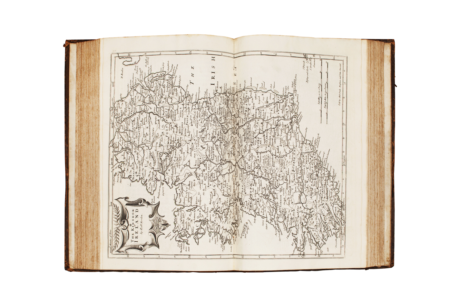 Britannia: or a chorographical description of Great Britain and Ireland... London: printed by Mary Matthews, for Awnsham Churchill and sold by William Taylor, 1722. 2 volumes, second edition, folio, portrait, title-pages in red and black, 60 plates and maps, contemporary blind tooled panelled calf, rebacked with raised bands to spines and black morocco gilt labels, bookplates, some damage to column 1069 affecting some letters, some very occasional light dust-soiling and some minor tears and worming [ESTC] (2)
