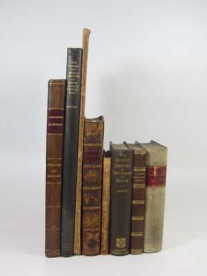 A walk in and about the city of Canterbury... Canterbury: Simmons and Kirkby, 1777. 8vo, author's signature pasted to foot of title-page, later Japanese vellum with red morocco gilt label to spine; Todd, Henry John Some account of the deans of Canterbury... Canterbury: Simmons and Kirkby, 1793. 8vo, later quarter calf gilt; James, Montague Rhodes The ancient libraries of Canterbury and Dover. Cambridge, 1903. 8vo, cloth gilt; Church of Christ... An historical description of the metropolitical Church of Christ, Canterbury... Canterbury Simmons and Kirkby, 1783. 8vo, contemporary calf rebacked; Prynne, William Canterburies doome..., 1646. 4to contemporary calf, lacks frontispiece and one initial leaf [ESTC R19620]; Woolnoth, W. and Hastings, T. A graphical illustration of the metroplitan cathedral church of Canterbury..., 1816. Folio, half calf gilt; Douglas, David C. The domesday monahorum of Christ Church Canterbury, 1944. Folio, black cloth gilt; Hastings, T. Vestiges of antiquity...in the suburbs of the metropolitan city of Canterbury, 1813. Folio, engraved plates, original boards; sold not subject to return (8)