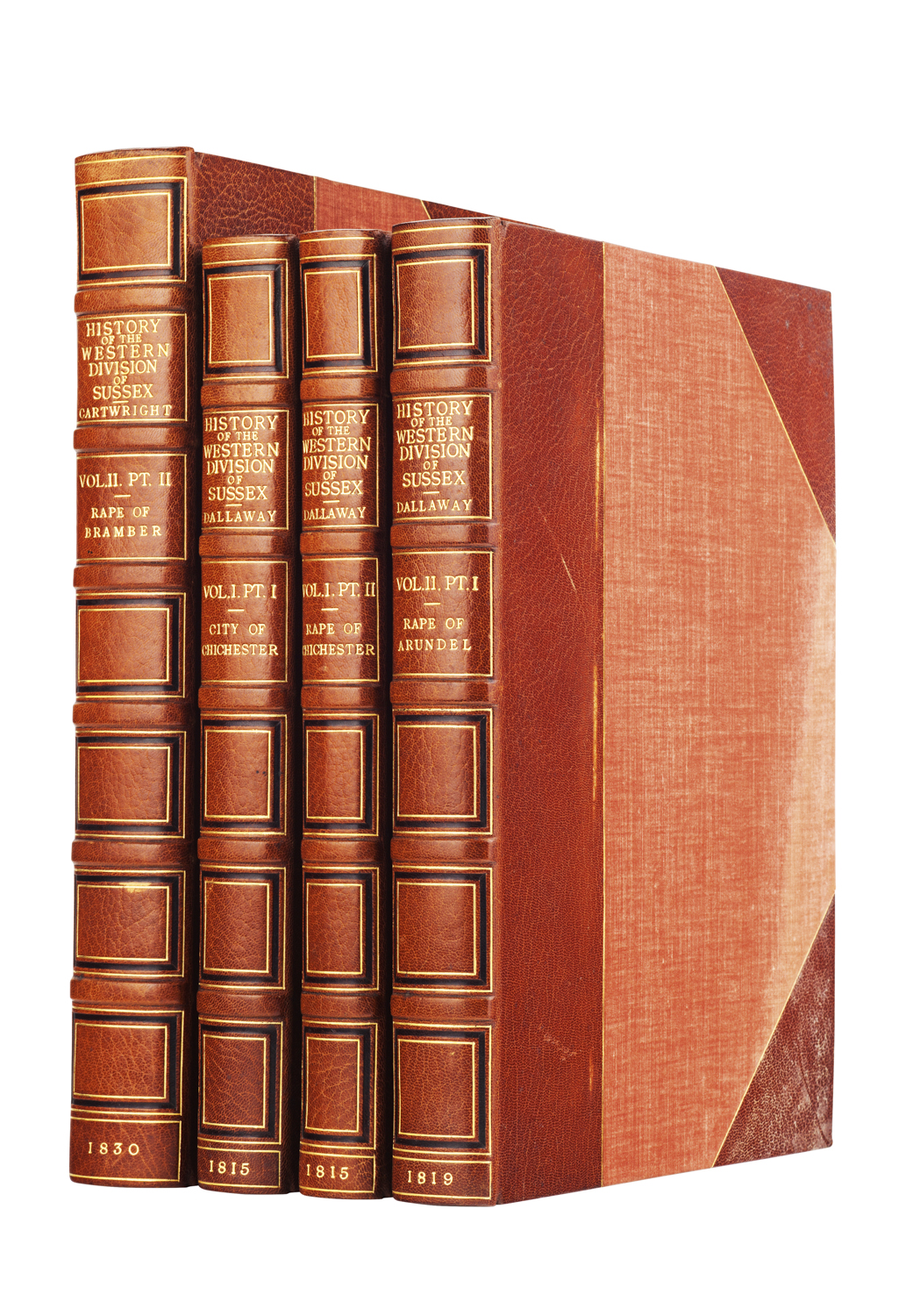 A history of the western division of the county of Sussex... London: printed by T. Bensley, 1815-1830. 2 volumes in 4, second issue, folio, many maps, plans and plates, several hand-coloured, and numerous hand-coloured armorials throughout text, half-morocco gilt, second book appears to lack pp.307-8, fourth book appears to lack gathering 'A', some dampstaining to covers; sold not subject to return