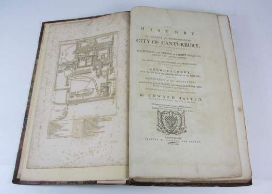 The history of the antient and metropolitical city of Canterbury... Canterbury: printed by Simmons and Kirkby, 1799. Folio, collates: [4], iv, ii, 16, 13*-16*, 21-28, 25*-28*, 29-128, 125*-128*, 133-396, 20, engraved frontispiece and 36 maps and plates, later half calf with red morrocco label and gilt tooling to spine, closed tear and small hole to pp.371-2, affecting some words, some foxing and offsetting