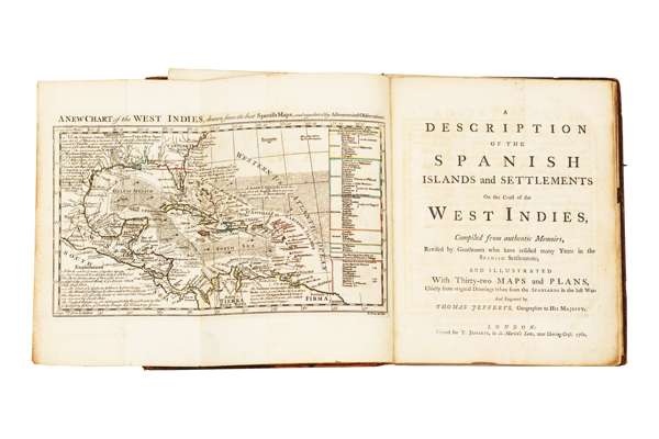 A description of the Spanish islands and settlements on the coast of the West Indies, compiled from authentic memoirs, revised by gentlemen who have resided many years in the Spanish settlements and illustrated with thirty-two maps and plans … London: printed for T. Jefferys, 1762. First edition, 4to., with an engraved folding chart (hand coloured in outline) as frontispiece, and 31 other folding engraved maps and charts, plate 6 misnumbered 5, and plate 16 as 15, contemporary calf, worn and rubbed, spine split, slight paper discolouration throughout, short tear at inner fold of plate 17 (The map of Cuba) and lower part of the inner margin also trimmed to allow for folding, small piece torn from the margin of plate 28 (not affecting printed matter), short tear at the inner margin where folded of the Map of San Domingo (plate 29)
