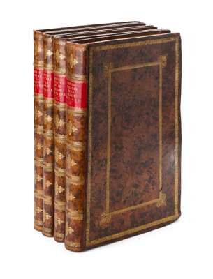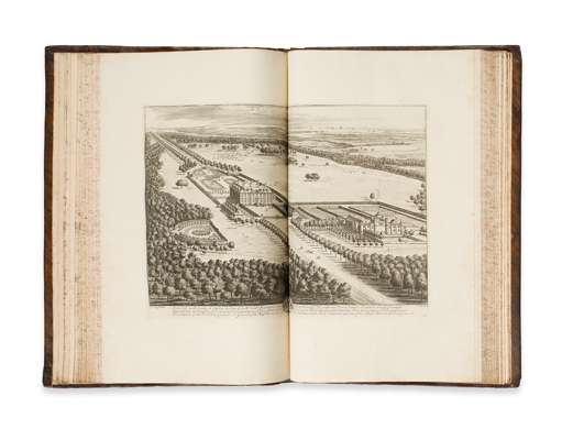 Nouveau theatre de la Grande Bretagne, ou description exact des palais du roy, et des maisons les plus considerables des seigneurs. London: David Mortier, 1716-14-15. 3 volumes and Supplement in 4 volumes, [comprising volume 1, parts 1 & 2, volumes 2 and 3, and supplement: Atlas Anglois], folio, titles printed in red and black, vignette coat-of-arms on title of volume 1 [listed as a plate in list] and 266 (of 271) engraved plates (some being 2 plates joined together, a few with 2 plates on one sheet), and 41 double-page maps in the Atlas Anglois bound at the end of volume 3, approximately 43 plates laid down and 38 cut down and mounted, volume 1 titles, text and plates remounted on new stubs, a few other repairs, a few plates lightly dampstained, contemporary panelled calf gilt, rebacked, with an uncalled for plate [Linlithgow] in volume 3