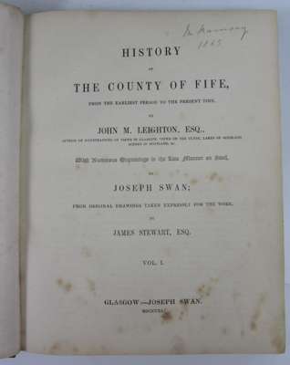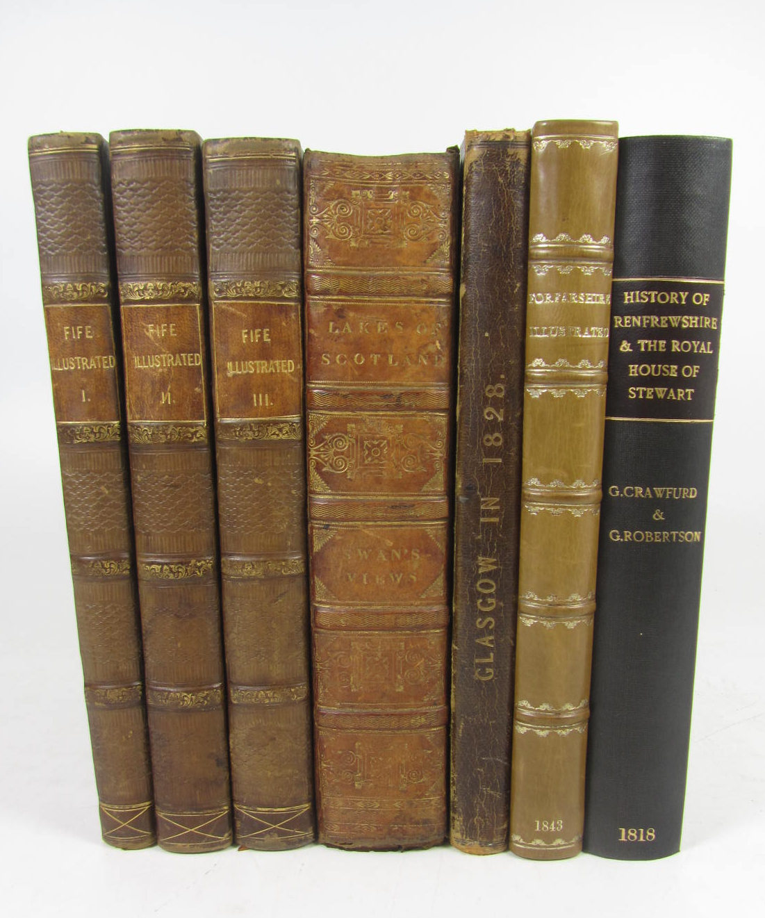 History of the county of Fife. Glasgow: Joseph Swan, 1840. 3 volumes, 4to, 3 engraved title-pages and 47 plates, contemporary half calf, some spotting and rubbing; [Idem] The lakes of Scotland. Glasgow: Joseph Swan, 1834. 4to, engraved plates, some hand-coloured, contemporary embossed calf; [Idem] Select views of Glasgow and its environs. Glasgow: Joseph Swan, 1828. 4to, frontispiece, 32 engraved plates, contemporary quarter morocco, some rubbing; Cumming, Gershom Forfarshire illustrated. Dundee: Gershom Cumming, 1843. 4to, plates, modern half calf; Crawfurd, George A general description of the Shire of Renfrew... Paisley: J. Neilson, 1818. 4to, plates and maps, modern quarter cloth, some browning and pen and colour pencil scribbles; sold not subject to return (7)