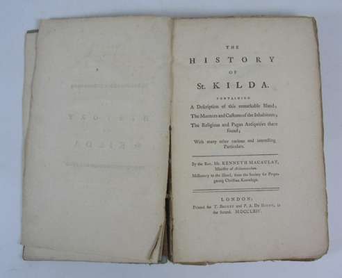 The history of St Kilda. London: T. Becket and P.A. De Hondt, 1764. 8vo, folding map, half-title and advert leaf, original blue publisher's boards,some pencil annotations and occasional ink marks, spine lacking [ESTC T90614]