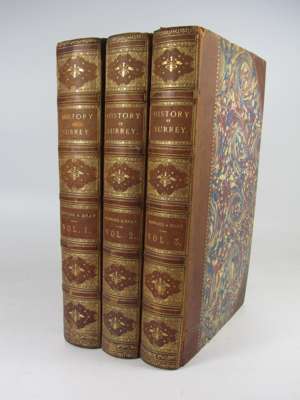 The history and antiquities of the county of Surrey. London: John White, 1804. 3 volumes, folio, 86 plates and maps, 13 tables (12 folding), contemporary half calf with raised bands and gilt tooling to spines, repairs to several leaves, some foxing and rubbing (3)