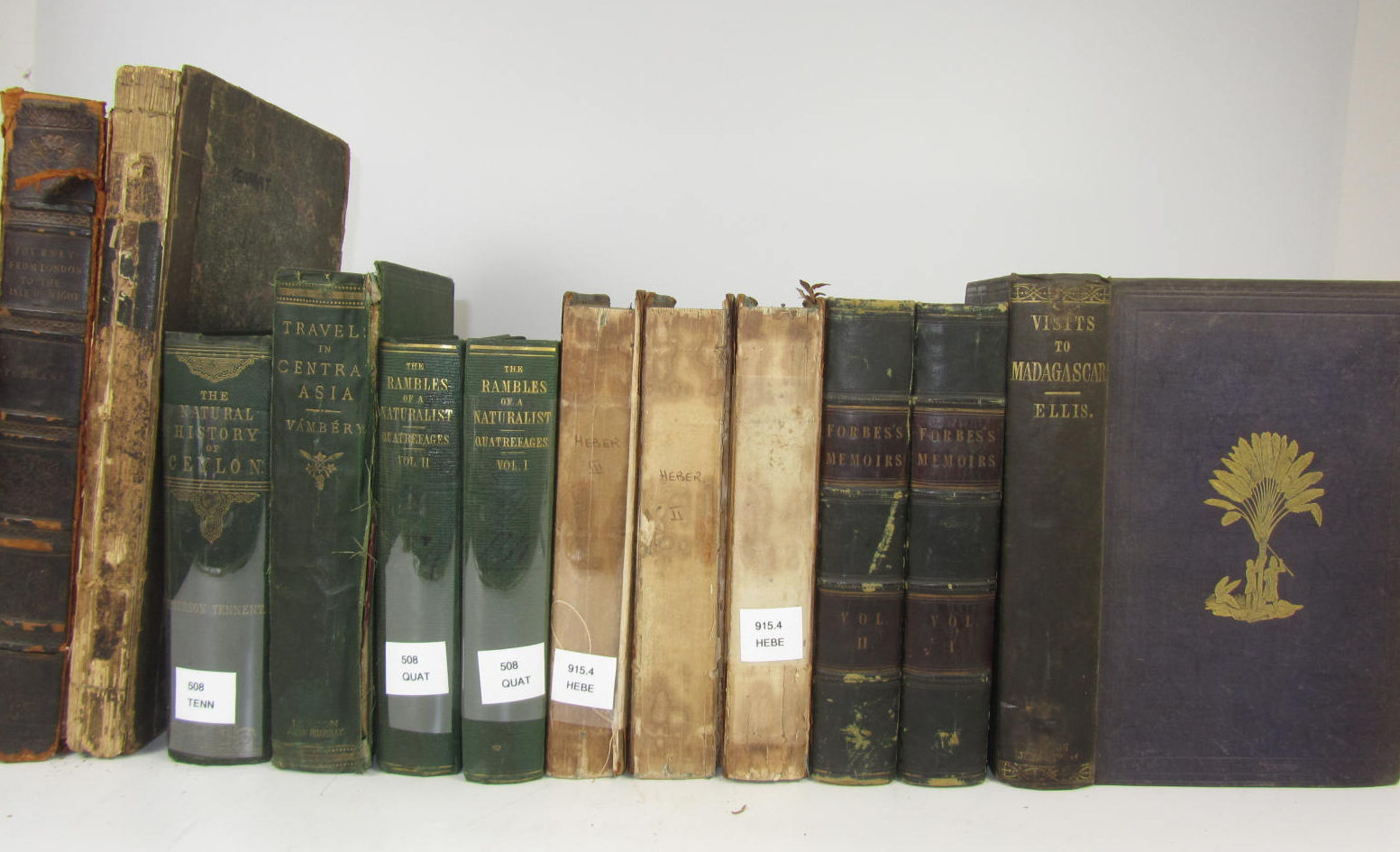Three visits to Madagascar. 1858. 8vo, map and 15 plates, original cloth, rubbed; Heber, Reginald Narrative of a journey through the upper provinces of India. 1828. Second edition, 3 volumes, 8vo, 28 plates, half calf, worn, covers detached; Mason, J.A. A treatise on the climate and meteorology of Madeira. 1850. 8vo, original cloth gilt; Forbes, James Oriental memoirs. 1834. 2 volumes, 8vo, frontispieces, half calf, spotted; Vambery, A. Travels in central Asia. 1864. 8vo, map in pocket, 12 plates, original cloth, worn, covers detached; Quatrefages, A. de The rambles of a naturalist on the coasts of France, Spain and Italy. 1857. 2 volumes, 8vo, original cloth, one hinge weak; Pennant, Thomas A journey from London to the Isle of Wight. 1801. 2 volumes in one, 4to, 2 folding maps and 47 plates, russia, some spotting, worn, covers detached; Pennant, Thomas A tour from Downing to Alston-Moor. 1801. 4to, 27 plates, original boards, uncut, worn, boards detached; Lyell, C. Elements of geology. 1865. 8vo, original cloth; Thurnham, J. On the two principal forms of ancient British and Gaulish skulls. 1865. 8vo, half morocco, and a quantity of miscellaneous material, all with RCSI library stamp(s); sold not subject to return (quantity)