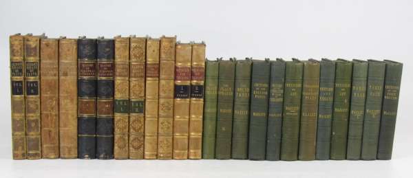Essays on the nature and principles of taste. Edinburgh: Constable, et al., 1825. 2 volumes, 8vo, contemporary half calf, marbled boards; [Idem] Sermons. Edinburgh: Constable, 1814. 2 volumes, 8vo, contemporary sprinkled calf; Murray, Alexander History of the European languages. Edinburgh: Constable, 1823. 2 volumes, 8vo, contemporary half calf, cloth boards; Burdon, W. Materials for thinking. London: Robinson, 1810. 2 volumes, 8vo, 19th century half light tan calf, marbled boards, red and black morocco lettering pieces; Edwards, Thomas The canons of criticism, and glossary. London: Bathurst, 1765. 8vo, 19th century light tan calf, spine decorated gilt in compartments; [Greenfield, William] Essays on the sources of the pleasures received from literary compositions. Second edition. London: Longman et al., 1813. 8vo, contemporary light tan calf; Wharton, Joseph An essay on the genius and writings of Pope. London: Richardson et al., 1806. Fifth edition, 2 volumes, 8vo, engraved portrait frontispieces to both volumes, volume one also with an engraved facsimile letter as frontispiece, contemporary light tan calf, spines decorated gilt in compartments, red and green morocco lettering pieces; and 12 others (24)