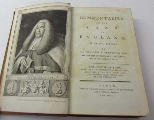 Commentaries on the laws of England in four books. The tenth edition with the last corrections of the author; additions by Richard Burn and continued to the present time by John Williams. London: Strahan, 1787. 4 volumes, 8vo, engraved portrait frontispiece, contemporary light tan calf, green morocco lettering pieces, rubbed